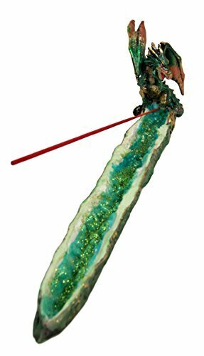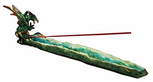 ? This is a beautiful semi shiny green dragon incense holder that features a guardian green dragon over a quarry of crystal emeralds. Burn your incense sticks with great style and get rid of those mundane old fashioned incense holders.