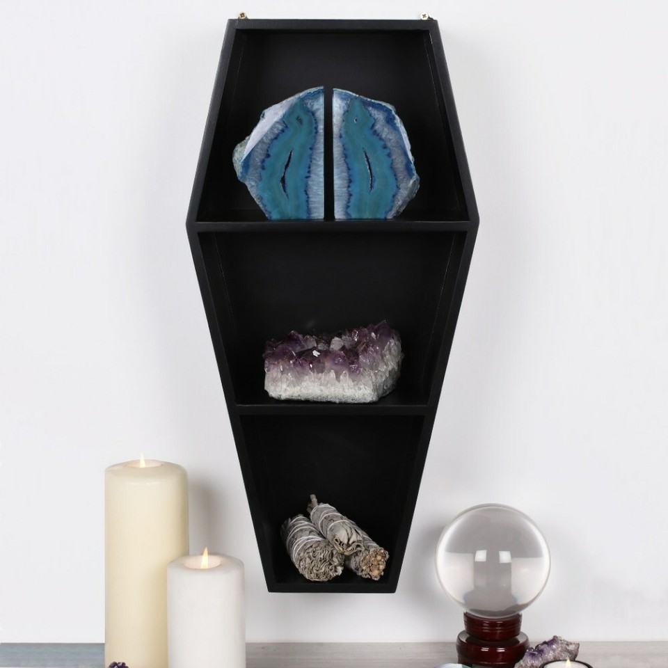 ? This coffin-shaped set of shelves provides a great design focal point for any room and is useful for displaying a variety of your most prized possessions, small oddities and taxidermied items.