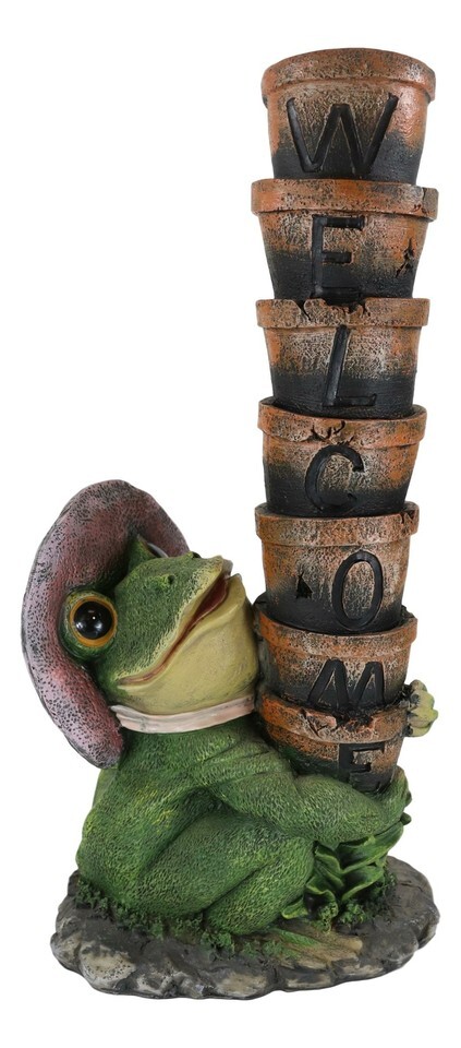 - Ebros Green Frog With Pink Hat Juggling Pots Stack Welcome Sign Figurine 14"H