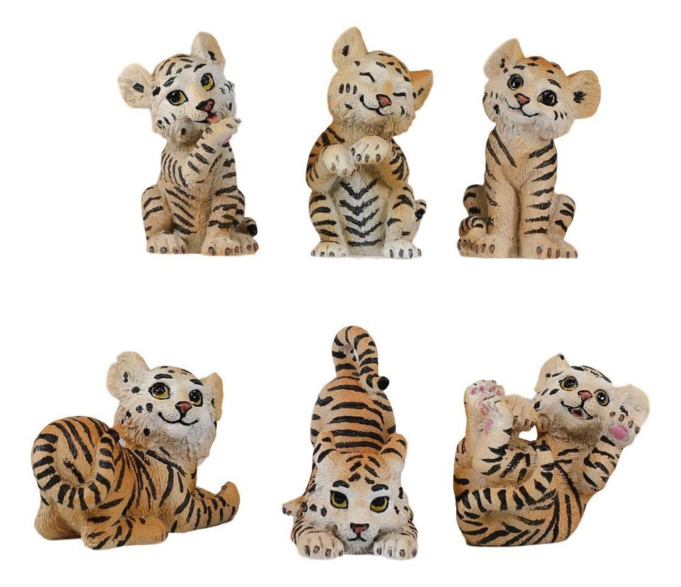 ? Here is a set of 6 assorted tiger cubs that will brighten up any shelf or tabletop. The set includes all the playful poses pictured, each with a unique personality. Their striking appearances, uncanny ferocity and cultural importance make tigers favorite icons worldwide.