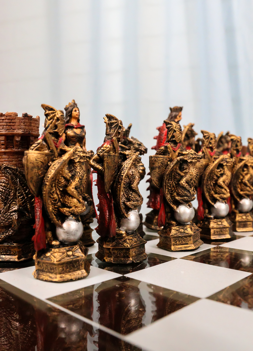 ? A game of chess can be elevated with this Legend Of King Arthur chess set. Two sides are colored in red and teal, featuring the legendary King Arthur, Morgan Le Fay as queen, Wizard Merlin as the bishop, The Black Knight on a dragon as Knight and a castle as the rook. The pawns are featured as dragons perching on a silver orb.