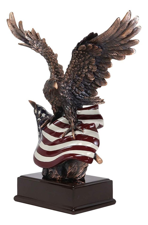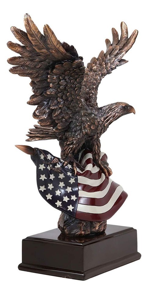 ? This Beautiful Broad Winged Bald Eagle Perching On American Flag Statue is made of the highest quality resin, undergoing the process of bronze electroplating giving it a uniform shine on the inside as well as the surface of the figurine. This process makes the figurine resemble the look of actual bronze but with much lesser weight.This figurine is designed with a matching base to beautifully decorate your office, home and space.