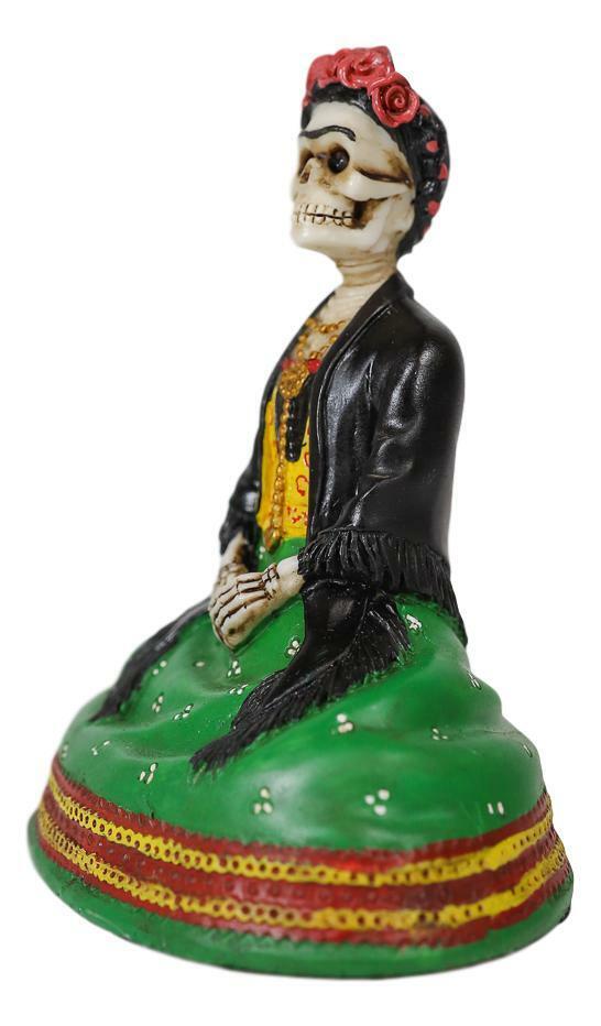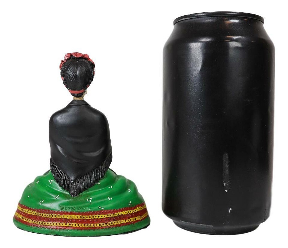 ? This Mexican Colors Day of The Dead Sitting Lady figurine is hand painted and finished by our artisans to give it almost real likeness and resemblance. Taken after the iconic La Pintora Frida Kahlo, this sculpture is true to her prominent features, as portrayed in many iconic photos of the La Pintora.