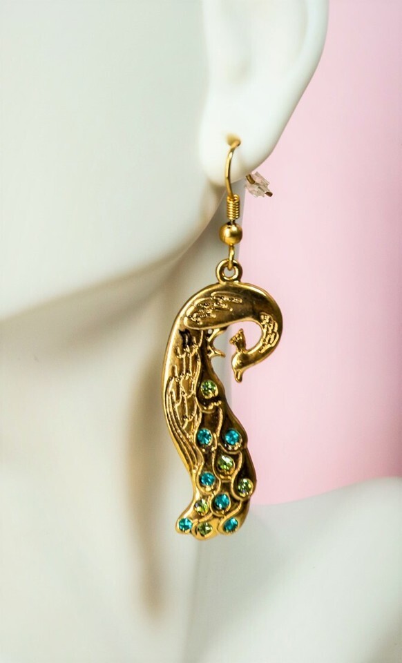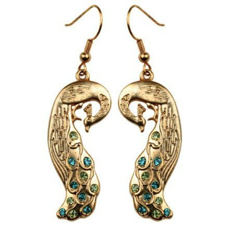 - Ebros Peacock Train Golden Jewelry Alloy Dangle Earrings Pair With Crystals