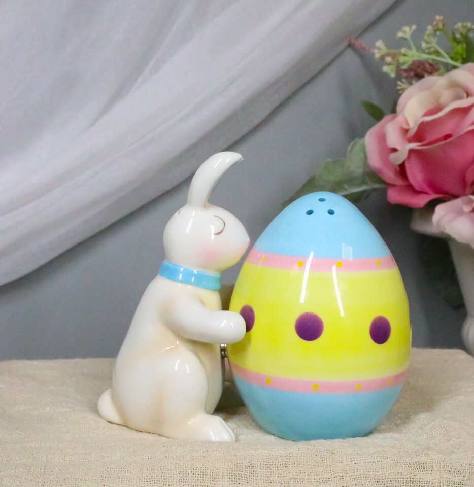 ? Add some flair to your kitchen and dining setup with these cool salt pepper shaker set. We feature the 'Easter Spirit' with this adorable bunny kissing its favorite giant egg. Painted in Easter festive colors of pastel blue, yellow, pink and white, they will be the perfect decorative accent pieces for your dining table, countertops or what have you!