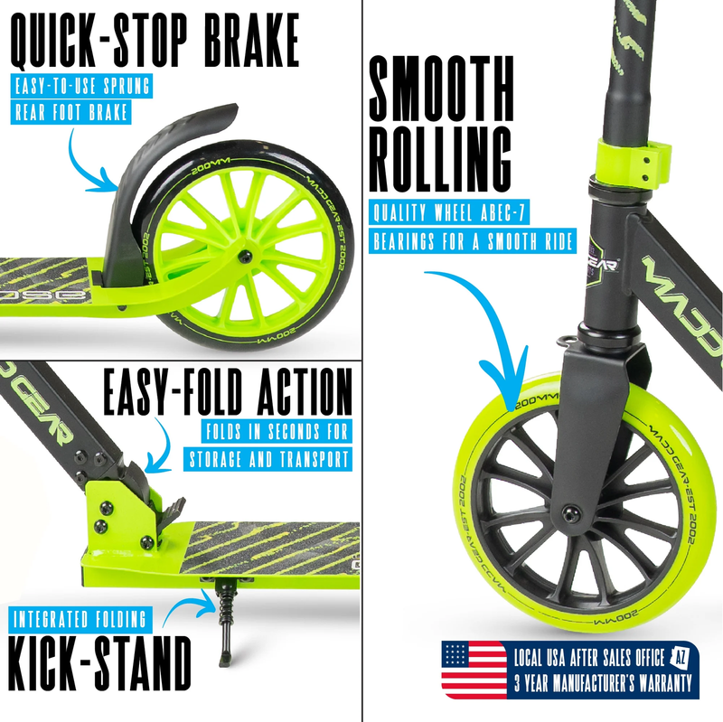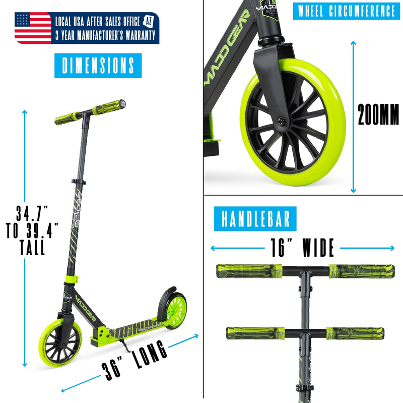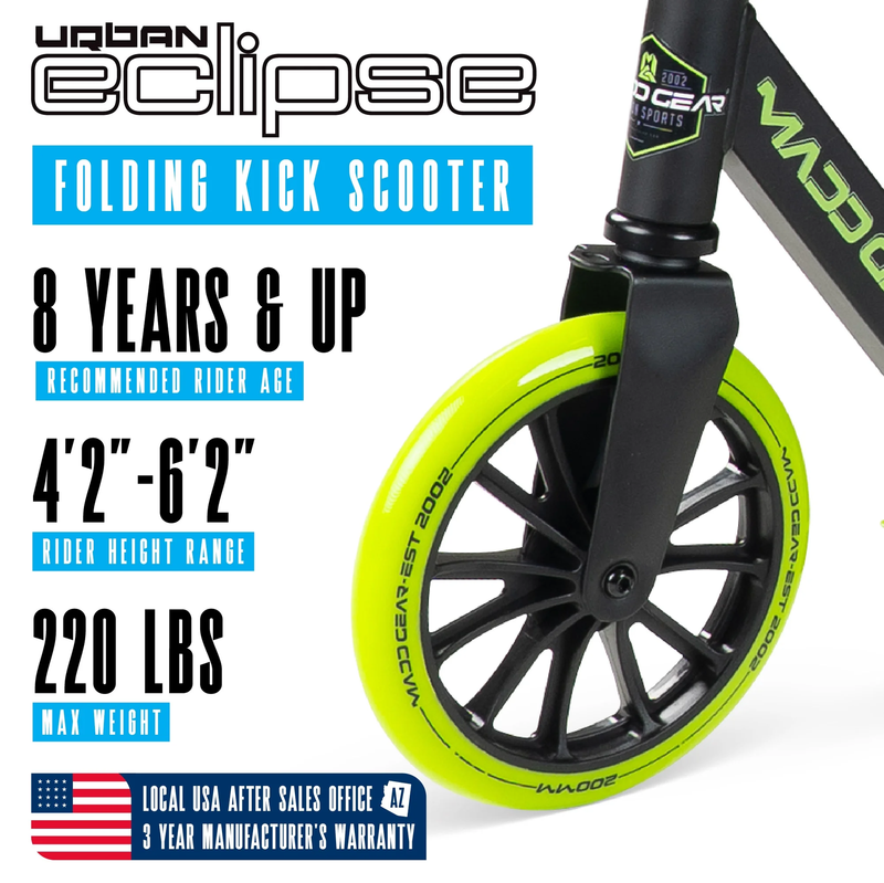 ECLIPSE 200 GREEN Madd Gear Eclipse 200 Big Wheel Folding Scooter - Ideal for big kids, teens or adults with an ultra-smooth ride on 8" wheels combined with tall height-adjustable handlebar! Ergonomic Low-Profile Deck Not Seen on Others - Swoops lower to the ground so pushing is more comfortable with less bending!