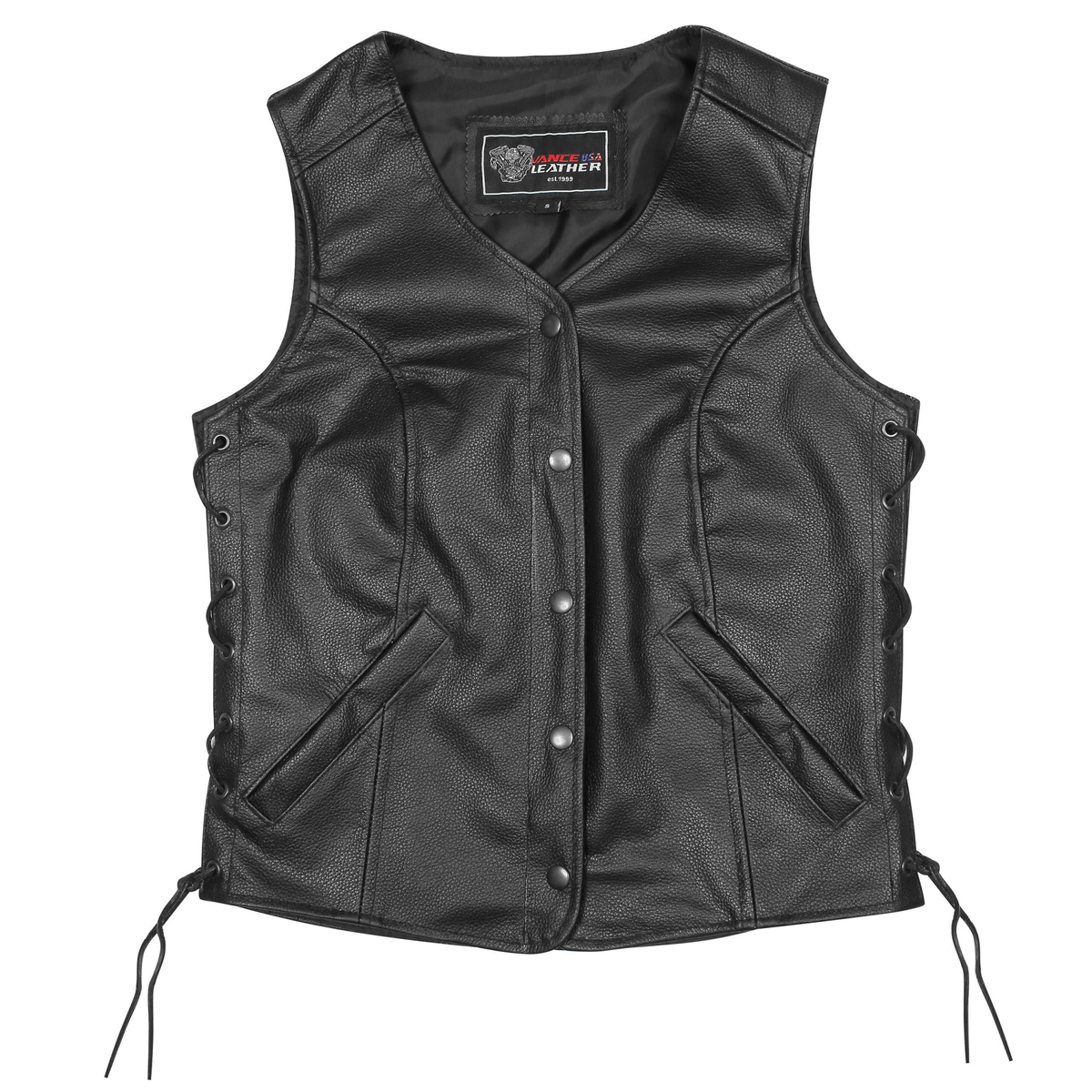 The Women s Five Snap Side Laced leather vest is a simple vest that is perfect for the lady who wants a streamline look. This vest has a great fit with side laces to contour the female body just right.