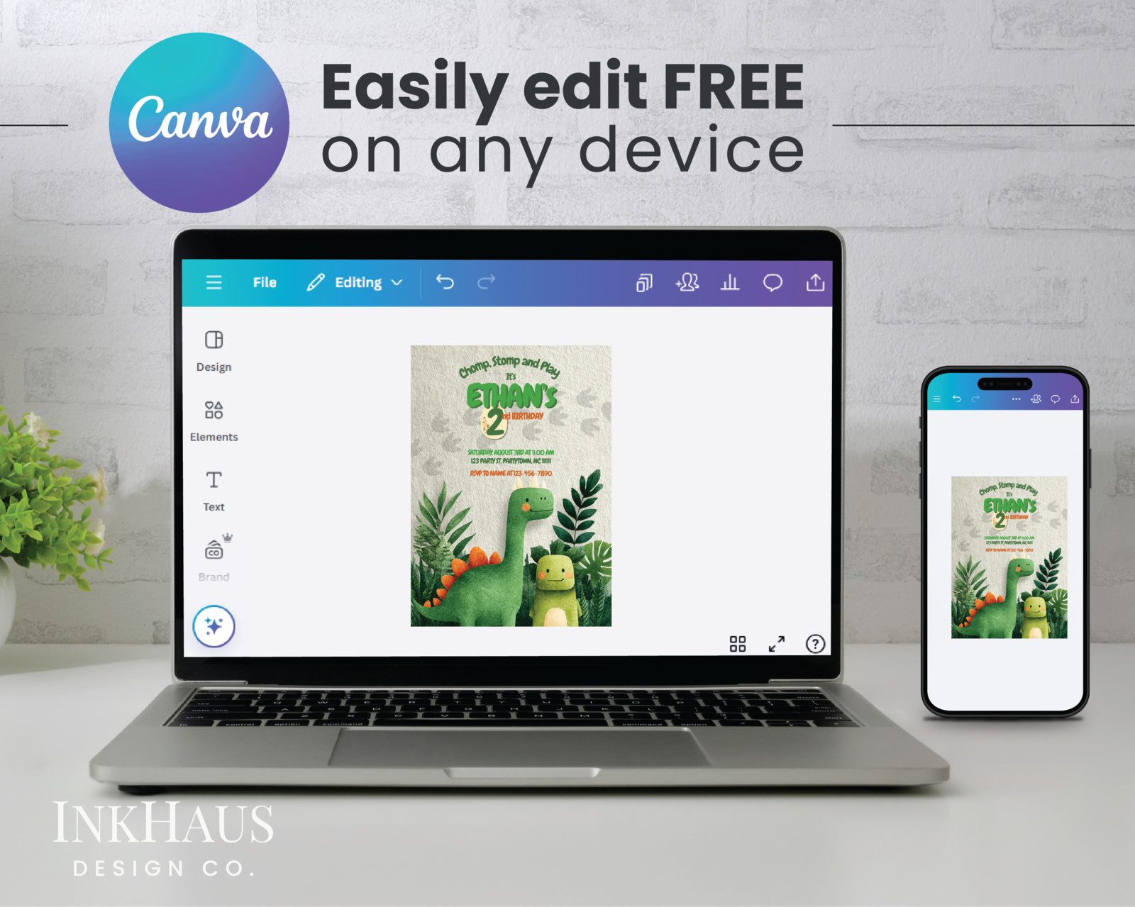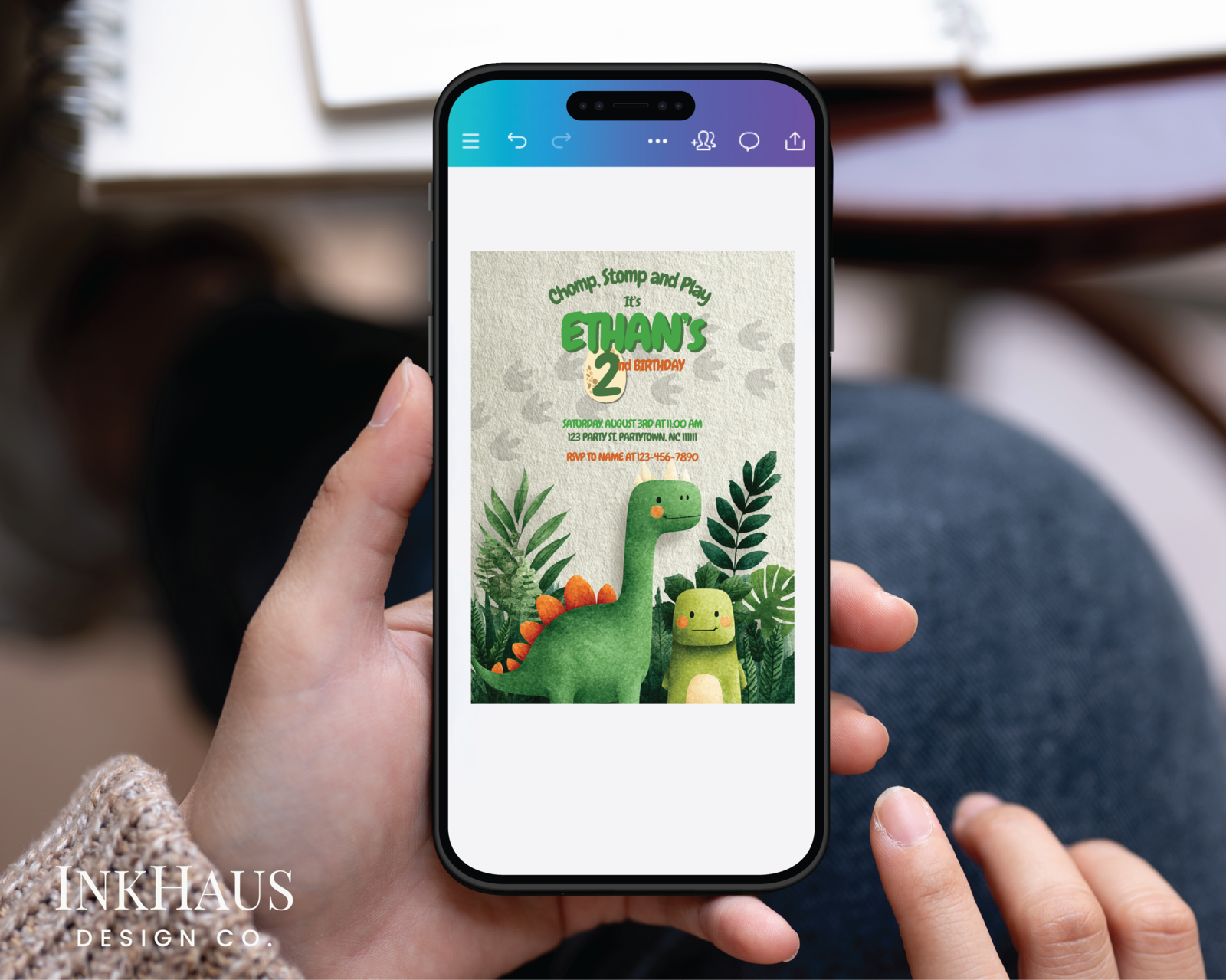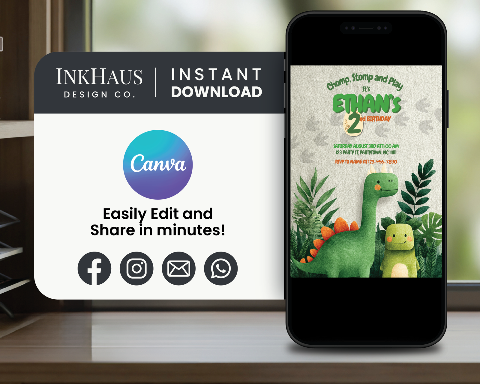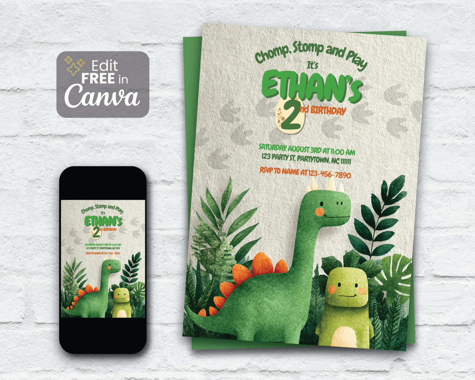 Editable Dinosaur Birthday Invitation – Cute Kids Birthday Party Invite Template, Adorable Digital Download for Boys or Girls, Canva