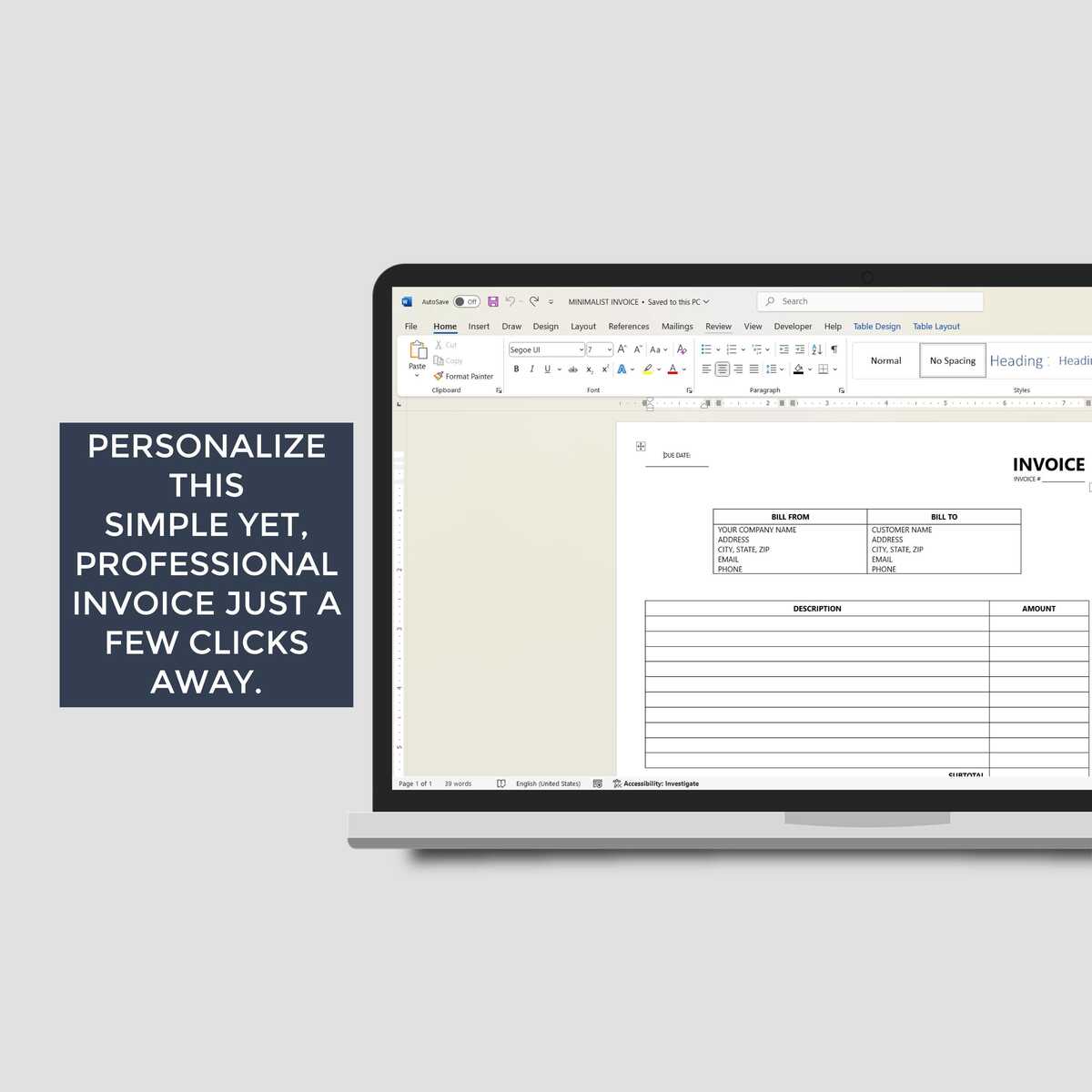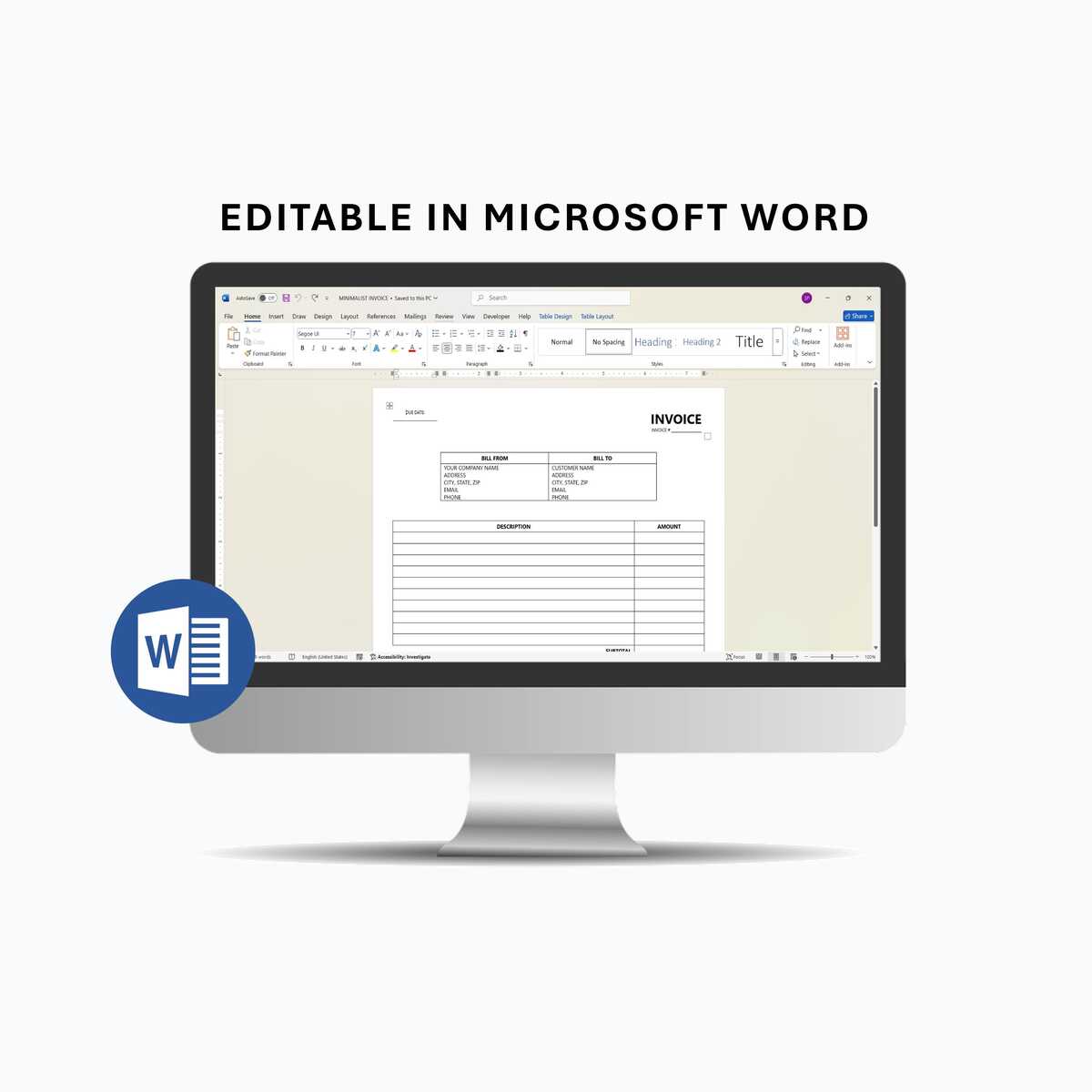 Minimalist Invoice Template — Clean and professional design, fully editable in Microsoft Word, size: 8.5" x 11"