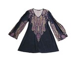 Effortless Style Boho Bell Sleeve Paisley Print Tunic Shirt Navy Purple Gold Med