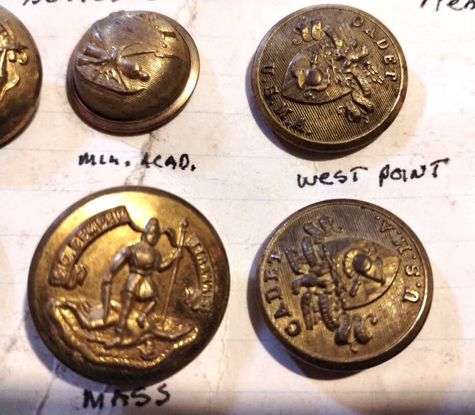 Vintage buttons from State militias or Military Academies including two West Point. Excellent to New condition, various manufacturers. Made to secure with cotter pins or similar but only one has that piece. Great opportunity.