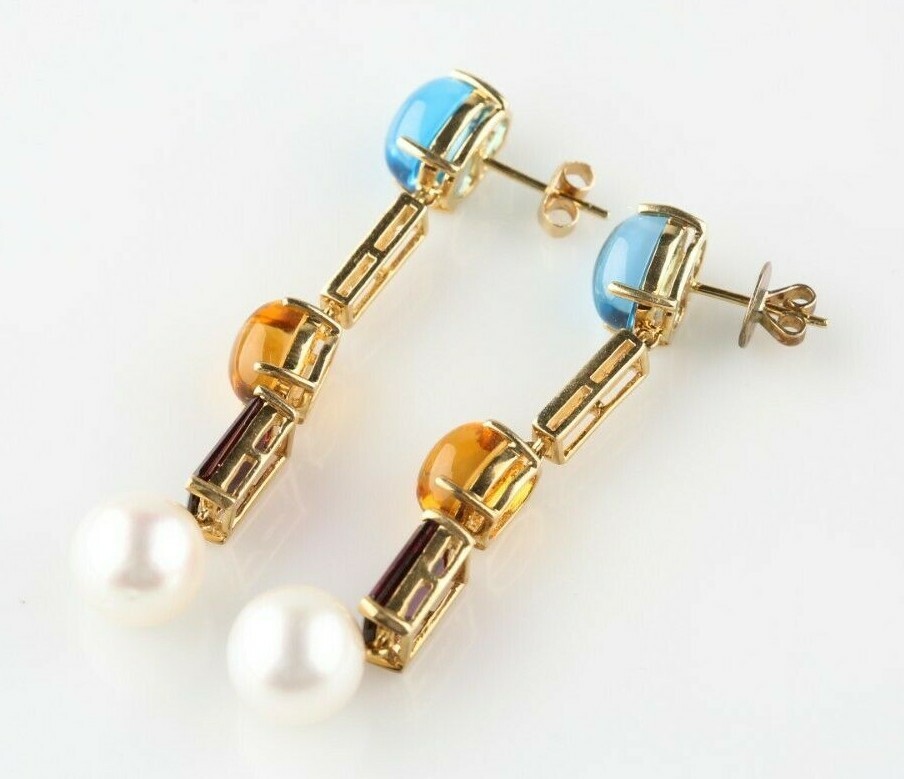 Einzigartige 14K Gelbgold Edelstein, Diamant Und Perle Ohrstecker Mit Tropfen