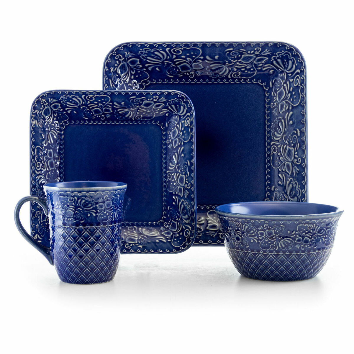 Add a touch of elegance to your home with the Elama Indigo Lotus 16 Piece Square Stoneware Dinnerware Set. This plate collection is crafted from quality stoneware and colored in a clean Indigo for a stunning staple piece that's durable and long-lasting. Each plate, bowl, and mug is laced with an intricate baroque design. Each dish in this set is dishwasher and microwave safe for easy cleaning and everyday use.