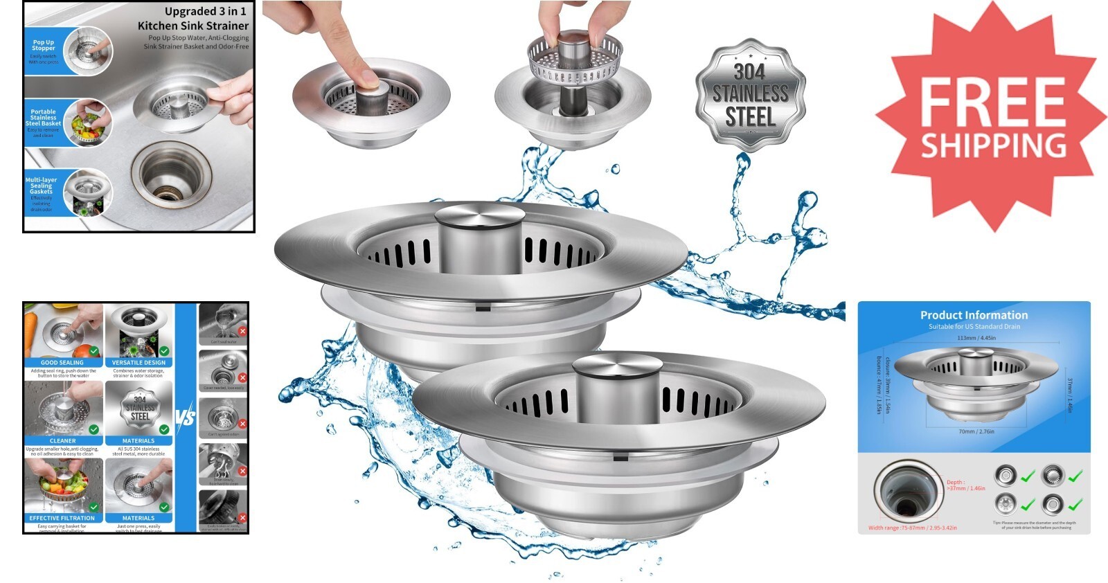 Upgrade your kitchen with our innovative 3-in-1 sink drain strainer, designed for effortless efficiency and durability. Made from stainless steel, it resists corrosion, scratches, and high temperatures, ensuring long-lasting performance. The upgraded bounce core allows seamless switching between stopper and drainage modes with one press, while the anti-clogging basket makes waste disposal easy and mess-free. Its universal US standard compatibility fits 3-1/2 inch drain holes, making installation straightforward for homeowners and professionals alike. Easy to clean and maintain, this sleek, modern strainer enhances your kitchen?s aesthetics while supporting environmental sustainability. Experience the perfect blend of function and style today.