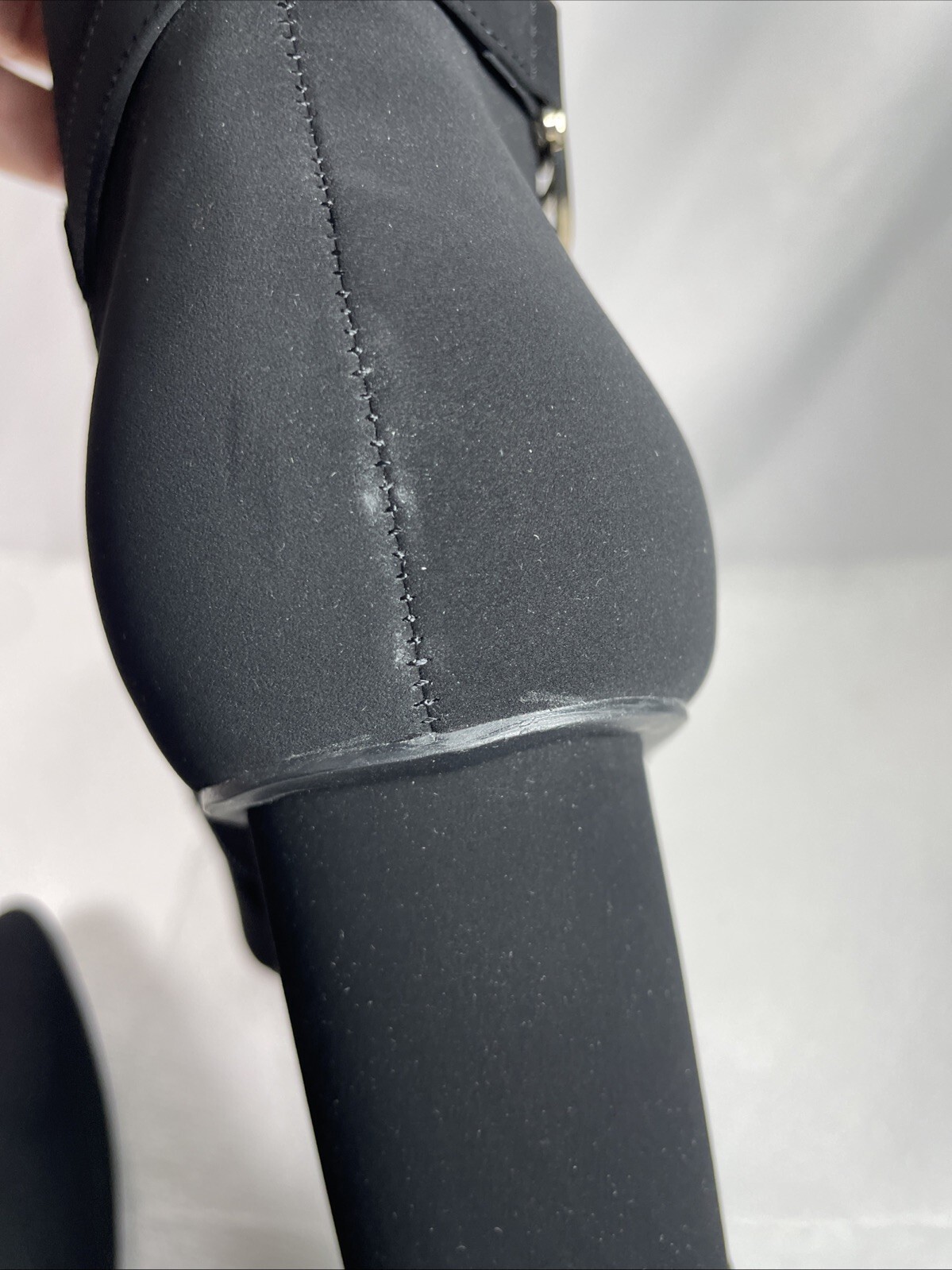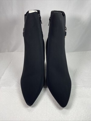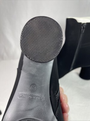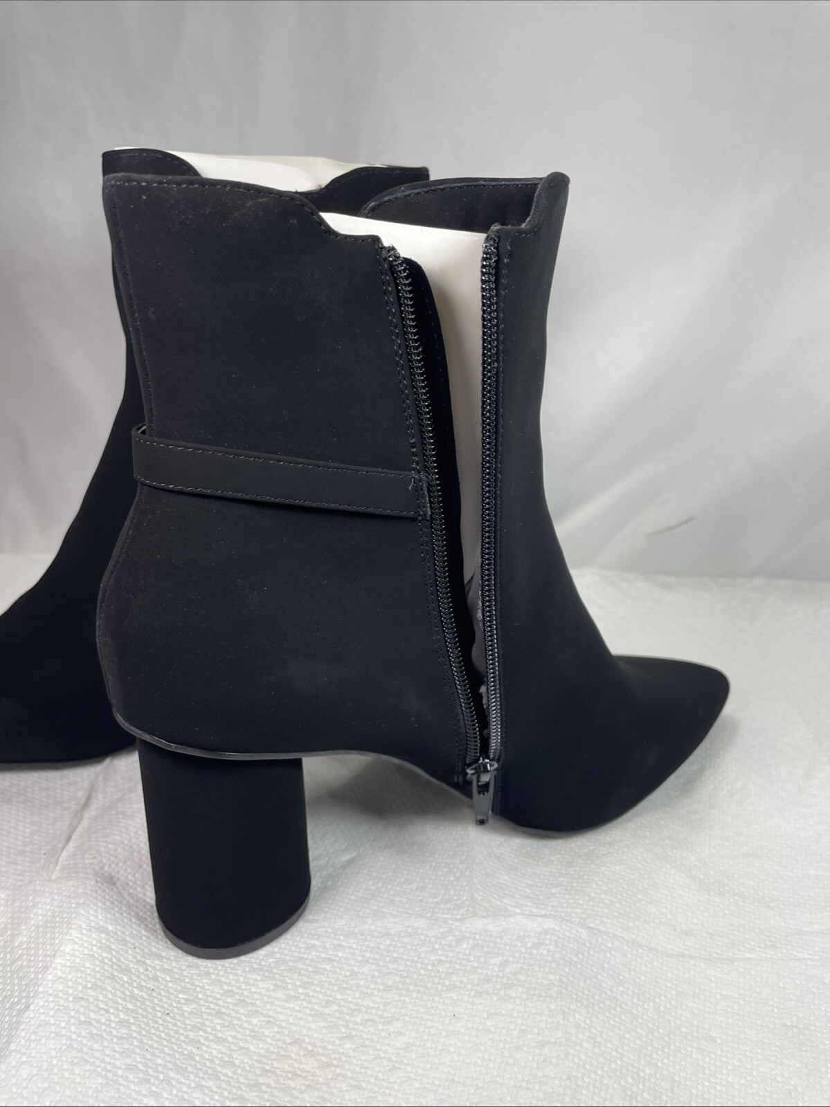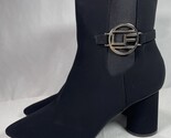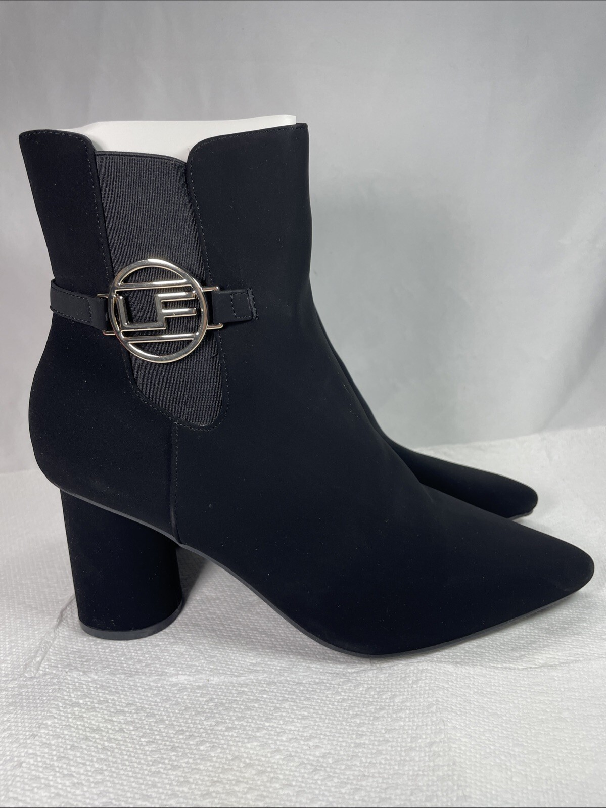 Elegant Black Ankle Boots 9.5M with Gold Logo Pointed Toe Suede Spool Heel NEW