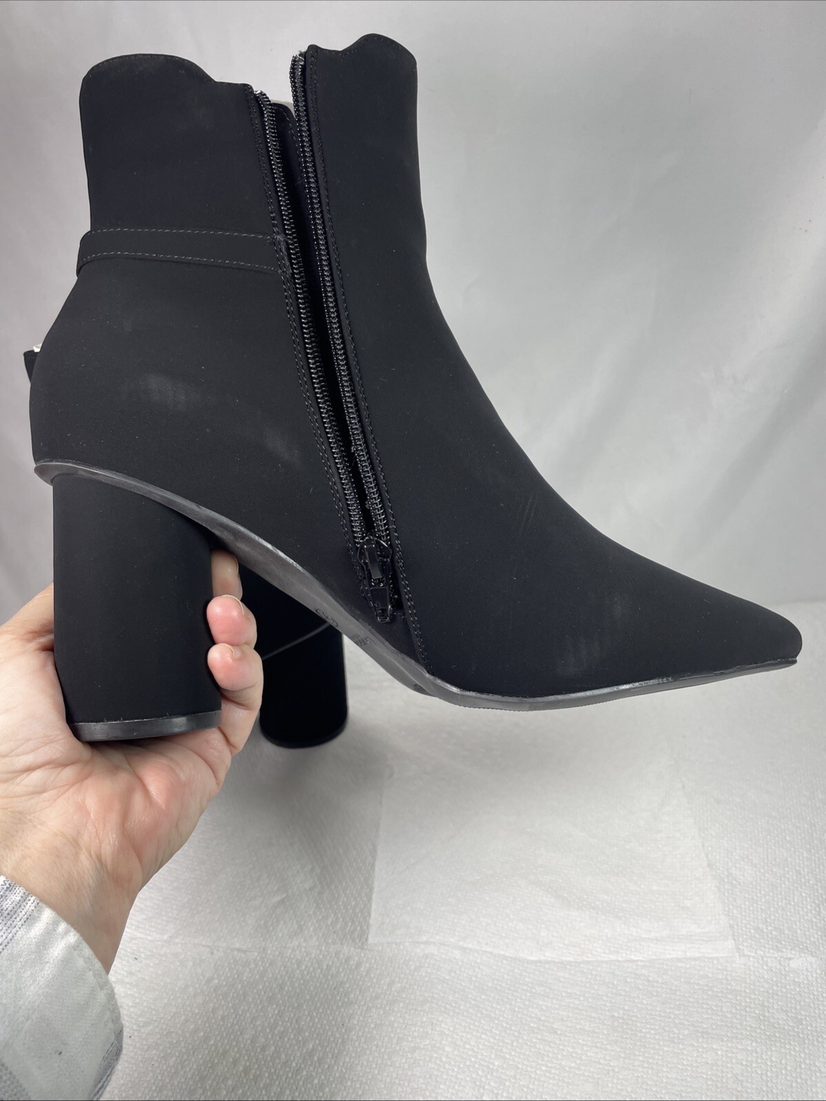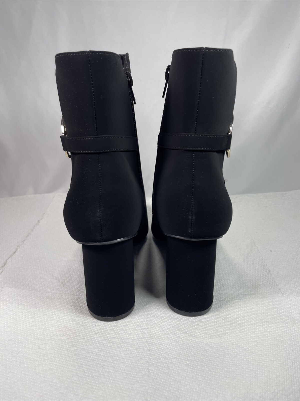 - Elegant Black Ankle Boots 9.5M with Gold Logo Pointed Toe Suede Spool Heel NEW