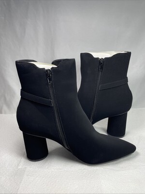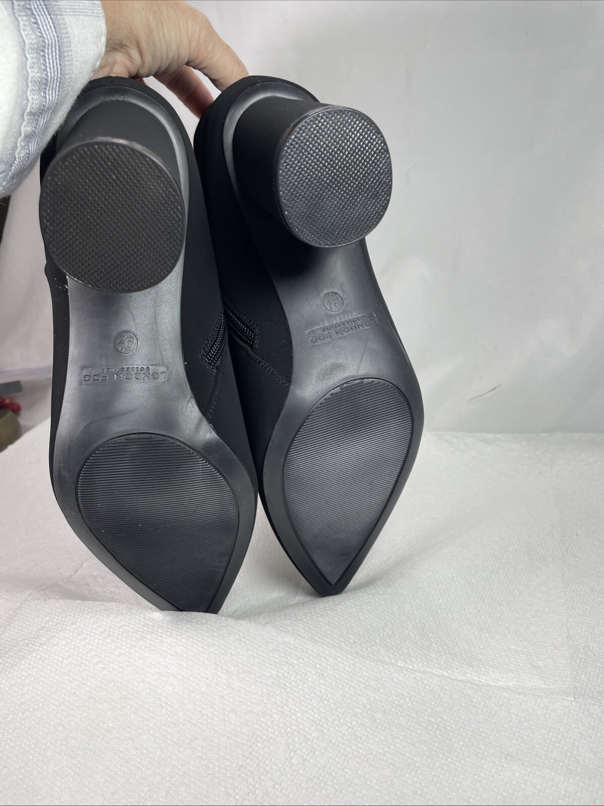 These elegant black suede ankle boots by London Fog feature gold logo detailing on the pointed toe, adding a touch of sophistication to the spool heel design. The spool heel and pump style make them both stylish and comfortable, perfect for completing any outfit with a touch of chic flair. Made with suede material and a zip closure, these boots are a standout addition to any woman's shoe collection, combining classic design with modern accents for a trendy look.