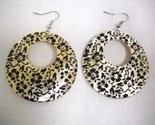 ELEGANT PEARLY WHITE MOP ROUND DANGLE HOOPS with a SMALL PRINT OF BLACK FLOWER / FLORAL DESIGN - REAL SHELL DANGLING EARRINGS