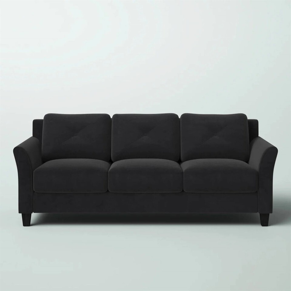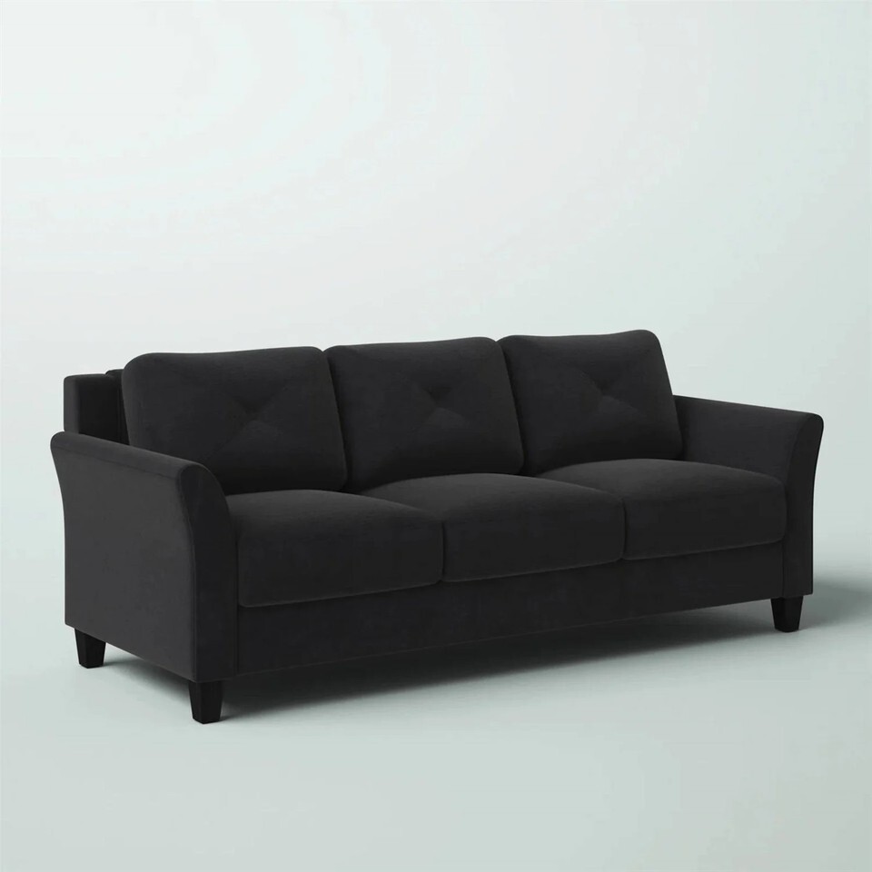 The flared arms and tufted back cushions add a touch of sophistication, making this sofa a standout piece in any modern home. Crafted with button tufting for extra plushness and sturdy black legs for reliable support, it's ideal for everyday use in your living room or den. FastFurnishings is renowned for delivering high-quality, affordable furniture that stands the test of time, and this microfiber upholstered sofa is no exception, offering easy maintenance and long-lasting beauty.