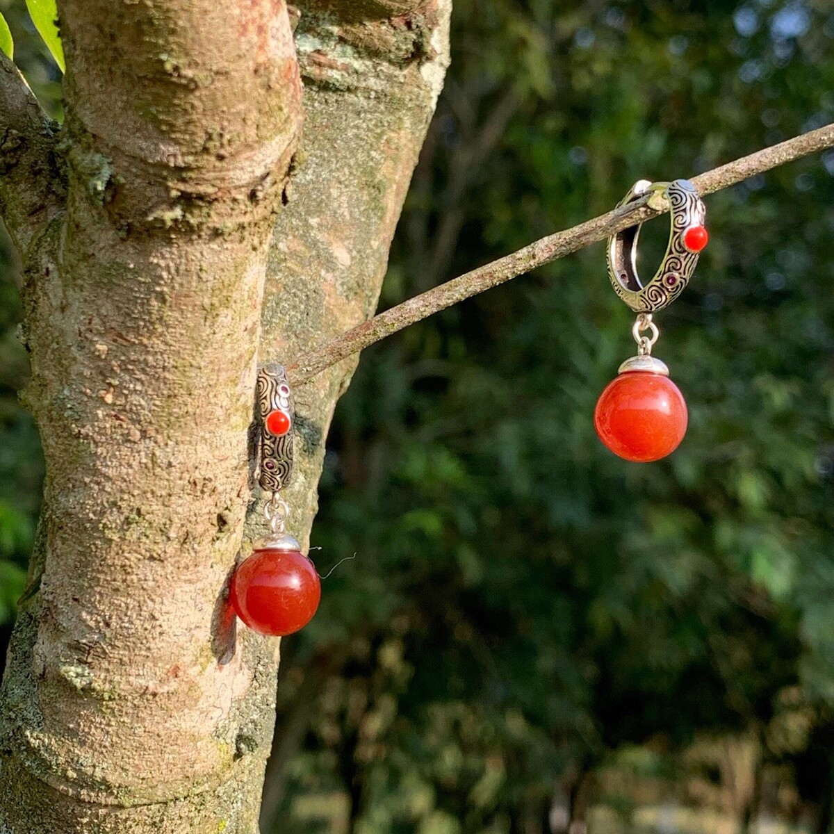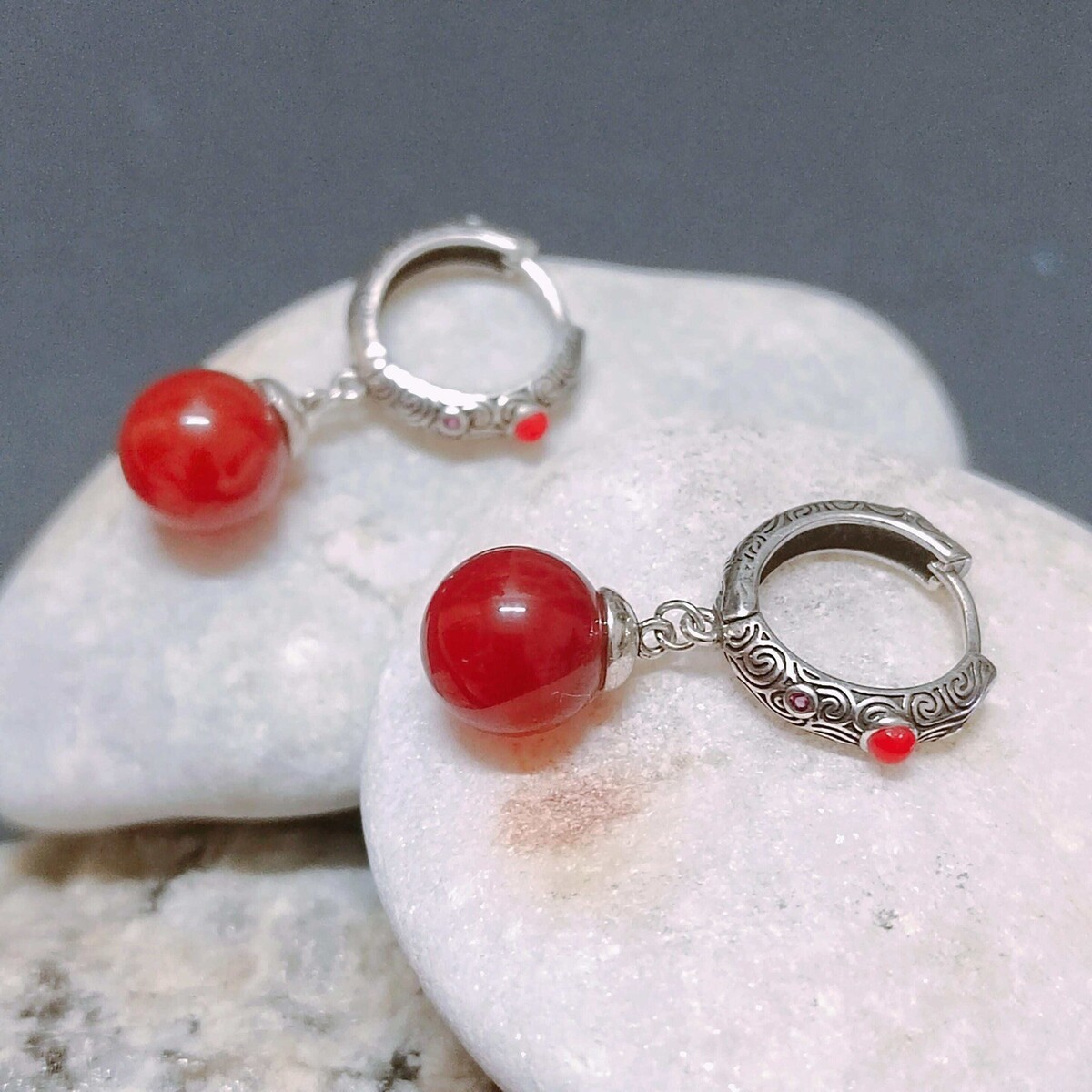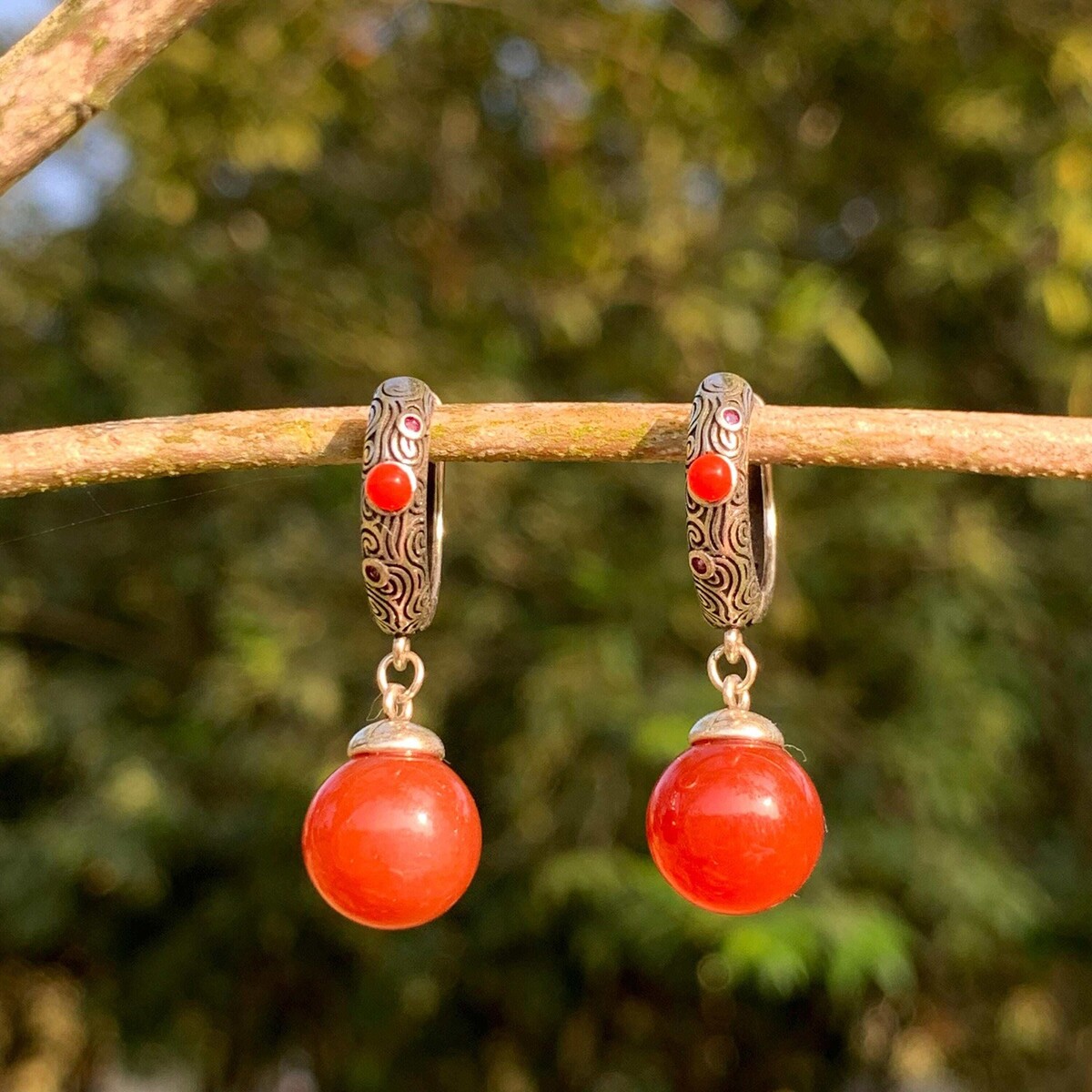 Elegant S925 Silver Design Hoop/Dangle Earrings | Certified A-Grade Natural Baoshan Southern Red Nanhong Agate SL256X15