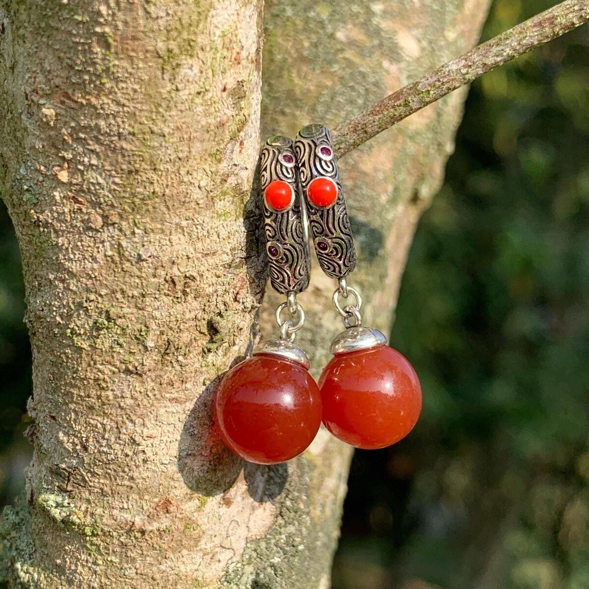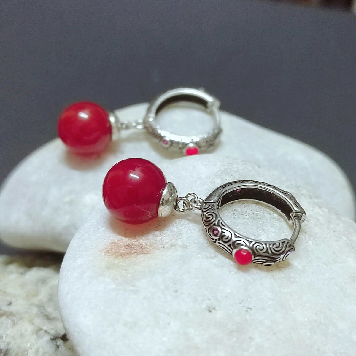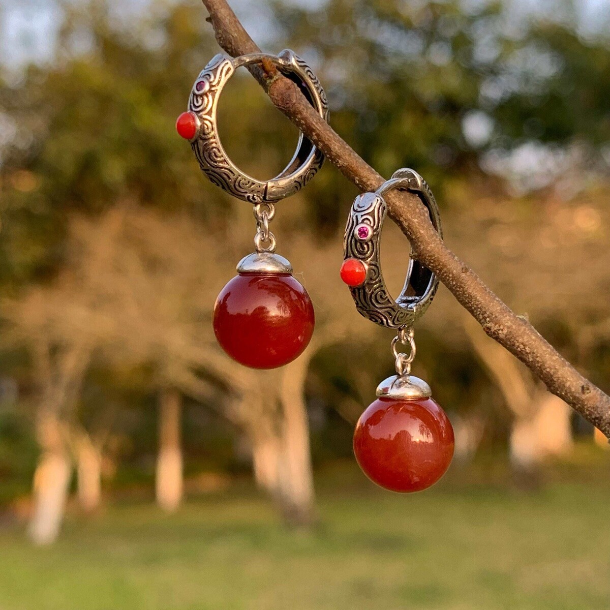 Elegant S925 Silver Design Hoop/Dangle Earrings | Certified A-Grade Natural Baoshan Southern Red Nanhong Agate SL256X15