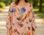 Description: Elegant and breezy, this Elena Baldi floral blouse features a stunning multicolor flower print on a soft dusty pink backdrop. Made in Italy from a luxurious silk blend (70% viscose, 30% silk), it drapes beautifully with its flowy asymmetric hem and relaxed silhouette. Size Large with 3/4 sleeves, it?s ideal for both casual and dressy occasions. The lightweight lining offers added comfort (95% viscose, 5% elastane). RN 75343. A perfect statement piece for spring or summer wardrobes.