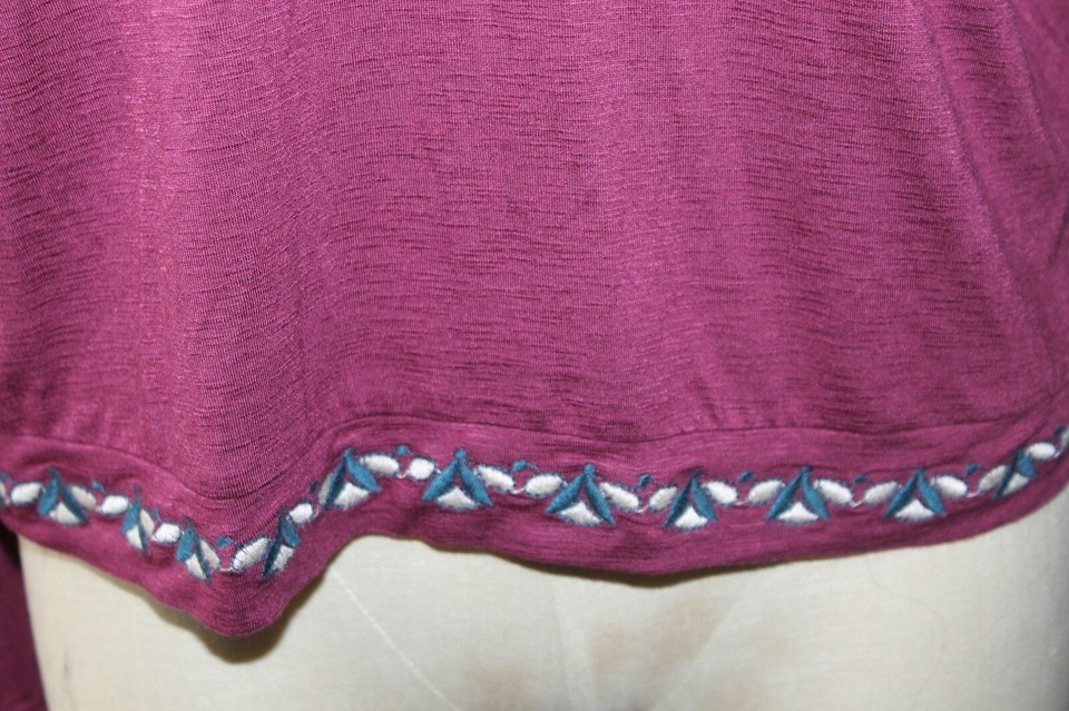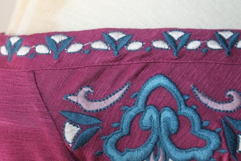Burgandy with blue browns and tan embroidery in rayon/spandex material