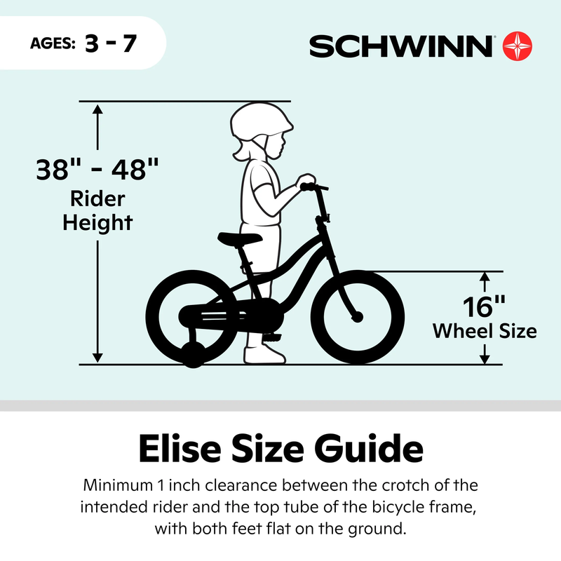 Featuring reliable stability with forward-positioned pedals, low standover height for easy ons and offs, and more control with a lightweight frame, the Elise offers a fit that's better for your little rider. This bike for kids includes a rear coaster brake plus a front hand brake that helps young riders learn to use big kid brakes while still relying on an intuitive and easy stopping option. A tool-free adjustable seat post helps the bicycle grow with your child, while the training wheels are easy to remove. The basket and tassels bring extra flair to every ride to make sure bike riding stays exciting. Give your little one the gift of riding with the Elise girls' bike.