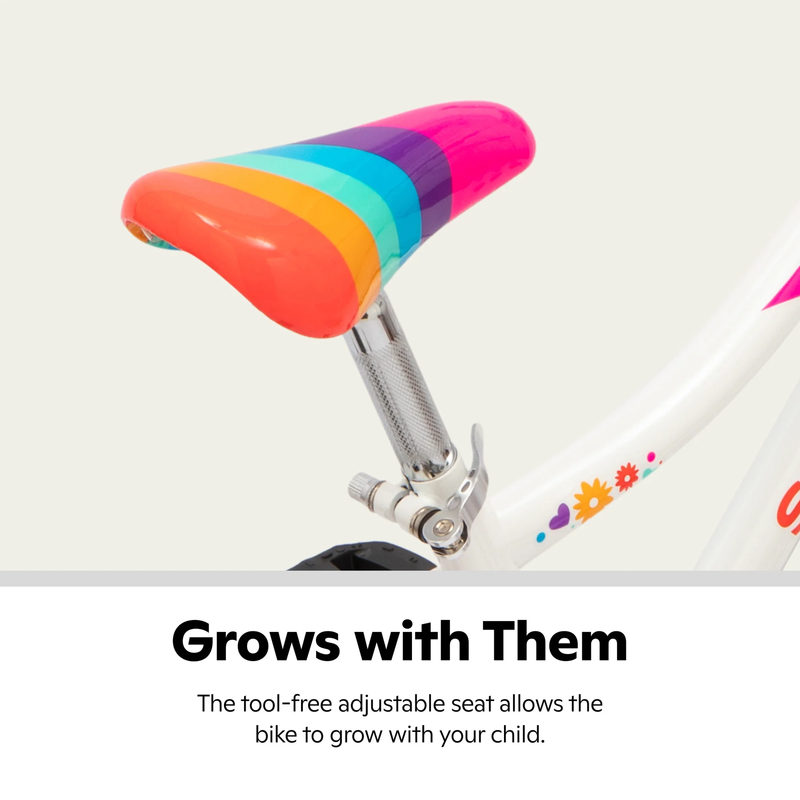 Comfortable, adjustable kids bike with training wheels for beginners Tech for better control, fit, and comfort with kid-sized components Includes coaster and hand brakes for easy, confident stopping Fun extras include chainguard, basket, flower grips, and handlebar pad Fits riders 38"?48" tall Quick assembly with common tools and easy instructions Tool-free adjustable seat grows with your child