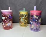 The Ello 12 Oz Kids Tumblers 3 Pack is a colorful and spill-resistant drinking cup designed specifically for kids. This set includes a rainbow, animal and unicorn themed tumblers, perfect for little ones who love bright and fun designs. Each tumbler comes with a straw for easy sipping and a convenient carry handle, making it a practical and fun choice for children on the go. Straws are intact and not chewed.