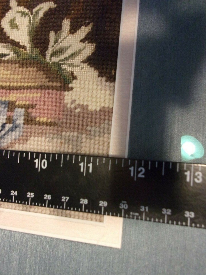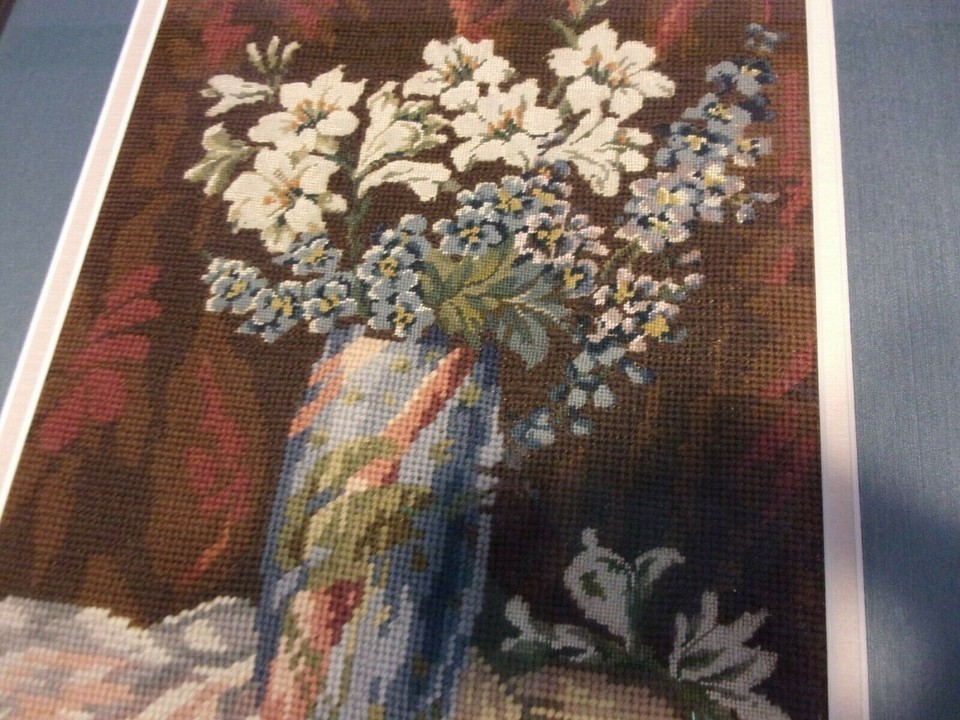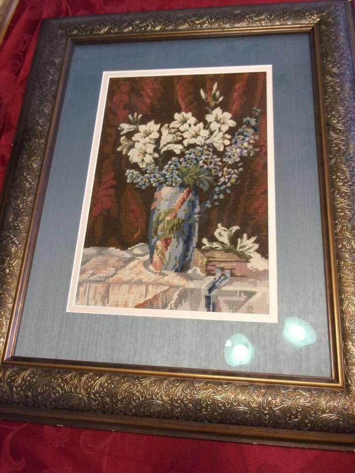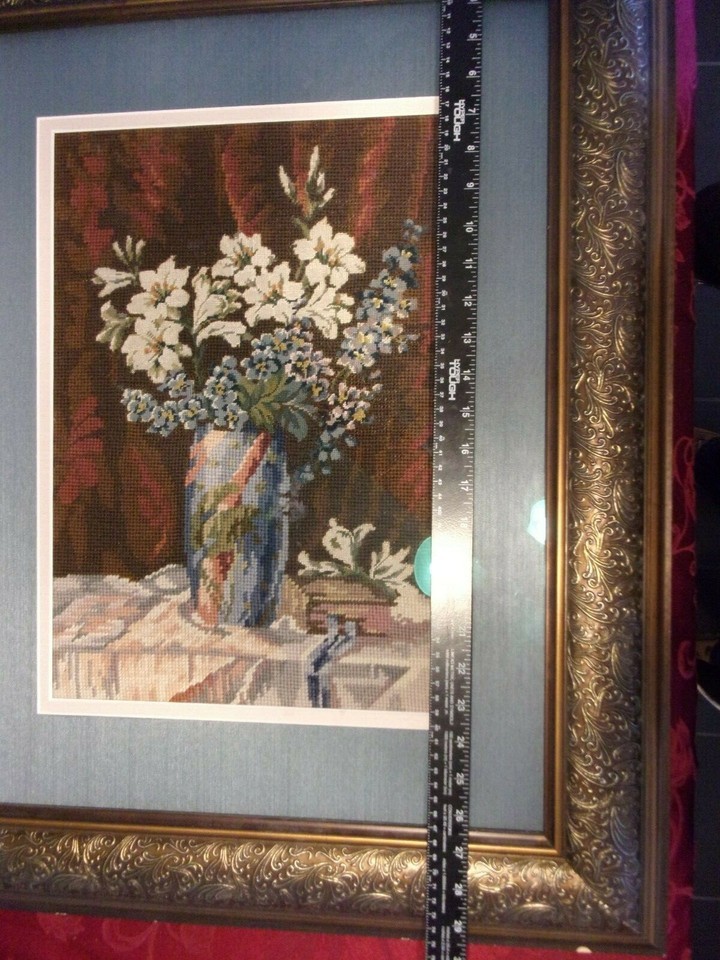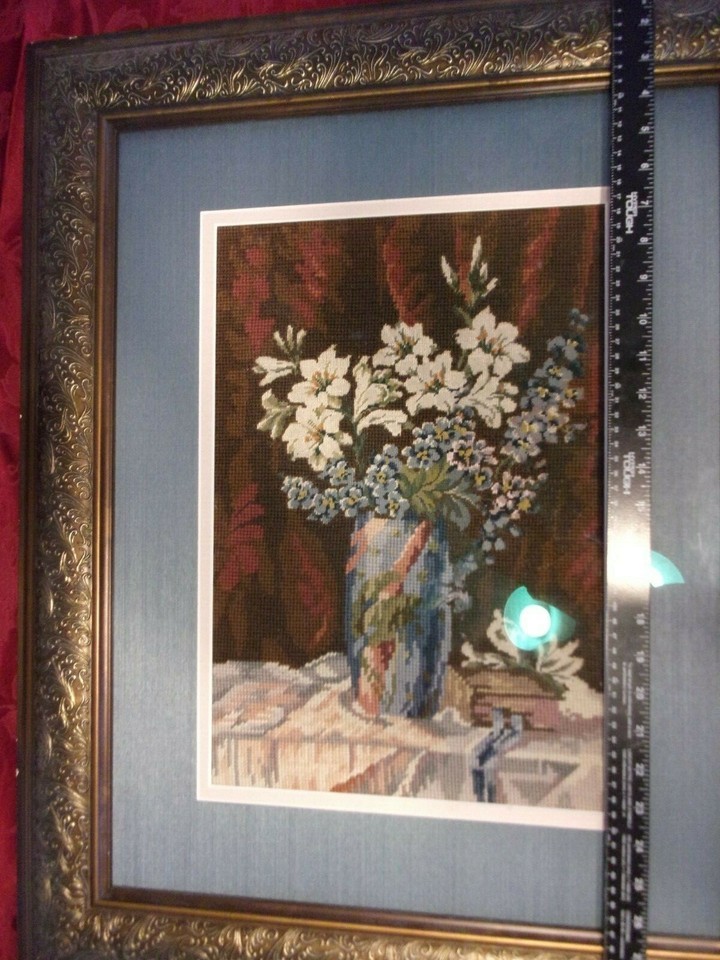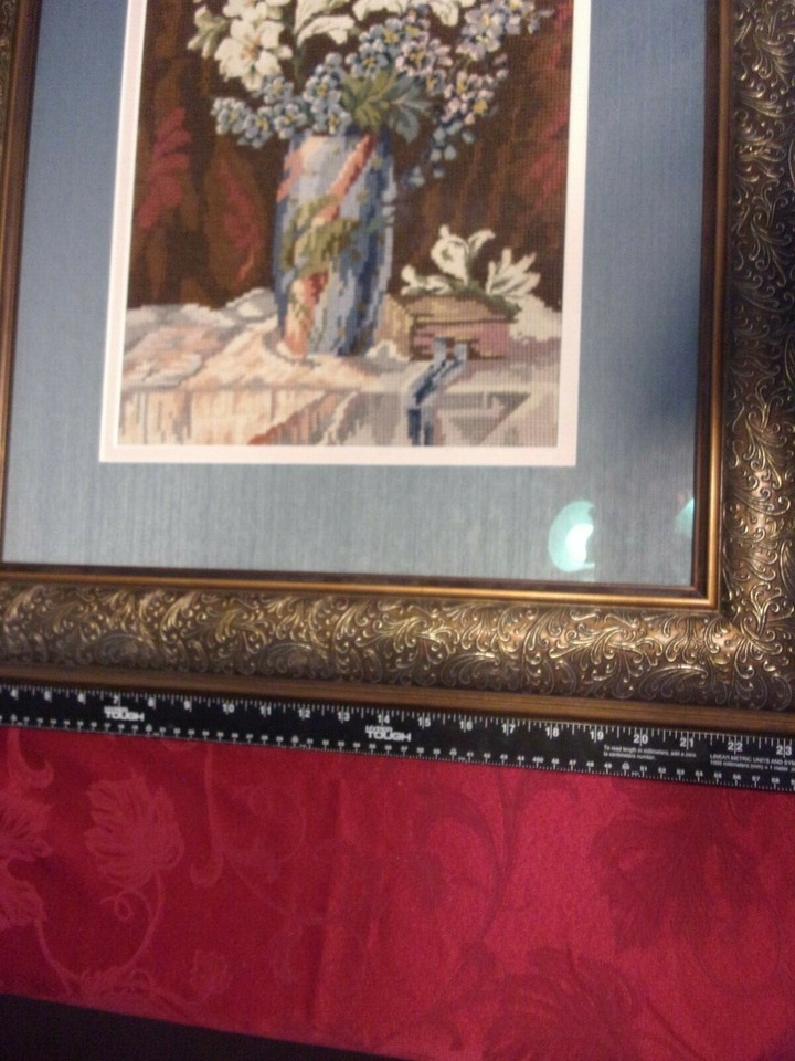EMBROIDERED BOUQUET IN BLUE MATTED BURNT GOLD VINTAGE FRAME SIZED 30" X 24.5"