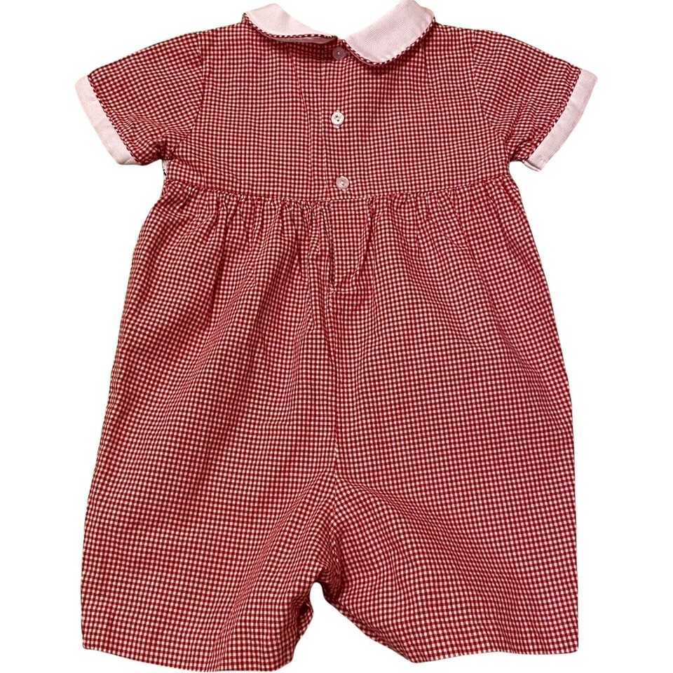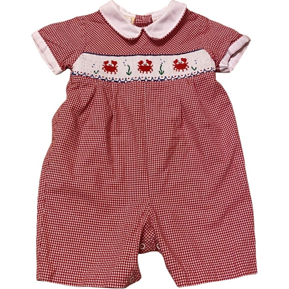 This adorable jumper is red/white checkered plaid with embroidered crabs, size 6 months, from a smoke-free and pet-free home. Like new.
