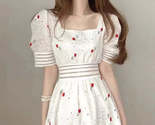 This sophisticated A-line dress features a square neckline and delicate hollow-out details, crafted from floral brocade fabric with a slim fit that flatters the silhouette. Designed with short puff sleeves and an empire waistline, it offers knee-length elegance perfect for summer. Made from a synthetic fiber blend with cotton elements and a convenient pullover closure, this dress combines comfort and style seamlessly. Originating from Zhejiang, China, it is an ideal choice for refined summer occasions.