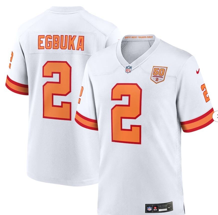 The replica jersey of Emeka Egbuka, the star rookie reciever for the Tampa Bay Buccaneers, to commemorate the team's 50th anniversary in 2025. The jersey is in the classic white and orange, representing the regular 76' season color scheme. Designed for men, this NFL fan apparel is perfect for showing support for both the team and player during games or casual wear. This unique and limited edition jersey is a must-have for any Bucs fan looking to celebrate this significant milestone in the team's history.