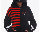 Feline cozy? Cuddle up for your cat nap in this Emily the Strange sherpa hoodie! This zip-up has an oversized fit and features solid black and black and red stripe color-blocking. Emily's face is embroidered at the chest, along with cat paws on the sleeves. Comes with a cat face embroidered on the hood, 3D plush cat ears and safety pin detailing. Complete with thumbholes, front pockets and a plush cat tail on the back.