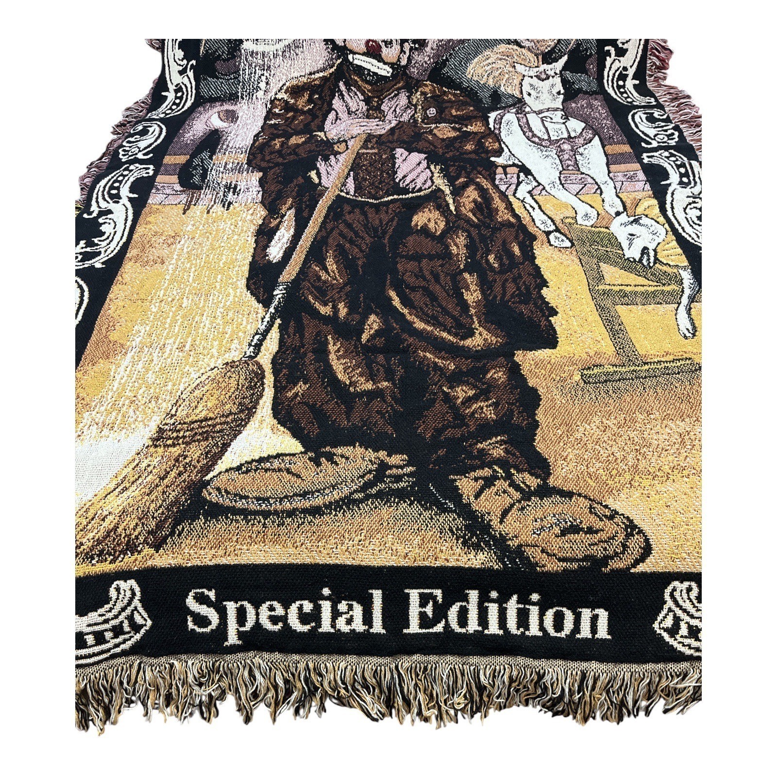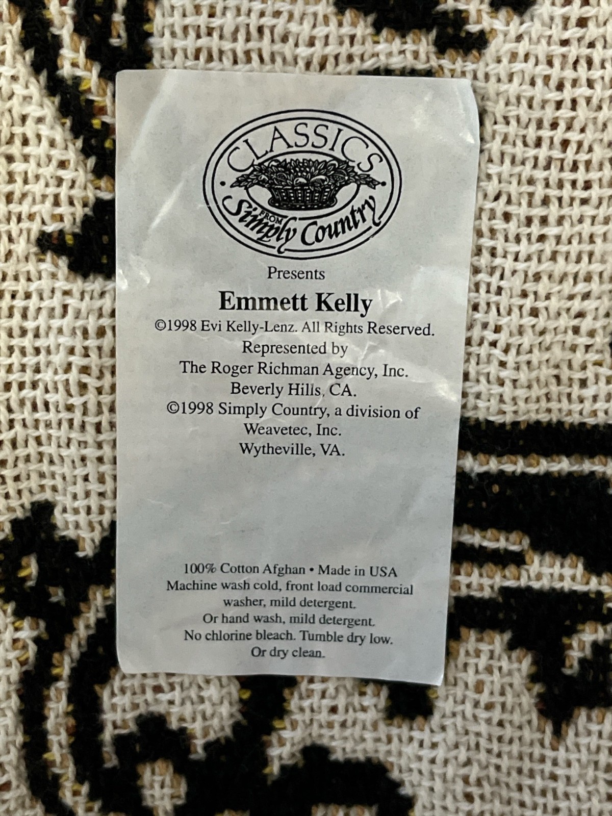 Vintage woven tapestry blanket featuring Emmett Kelly, the famous American clown, leaning on a broom with circus imagery in the background. Designed as a 100th Anniversary Special Edition release by Simply Country, a division of Weavetec, Inc. Made in the USA from 100% cotton. This collectible afghan celebrates one of the most beloved circus figures.