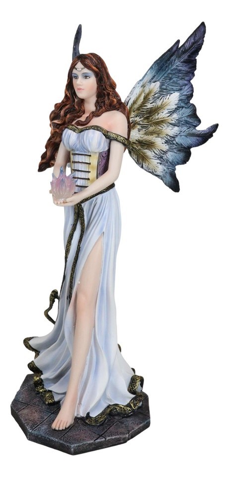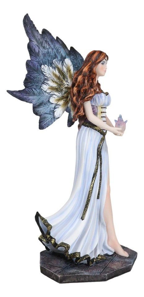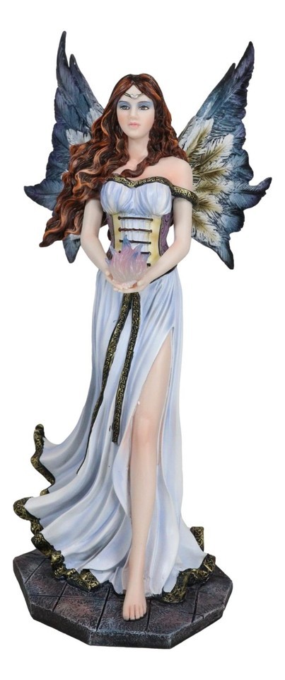 ? This Fairy With Blue Flame Statue is a delightfully detailed fairy and a fit for any home or office with a similar theme. This red haired beauty is wearing a white corset on top of her long white gown. Her wings match her dress and she holds a blue ember flame in her hands. This charming statue is sure to draw lots of attention to any space. This would will also make a great decoration and fantastic gift for that special person with the love of fairies!