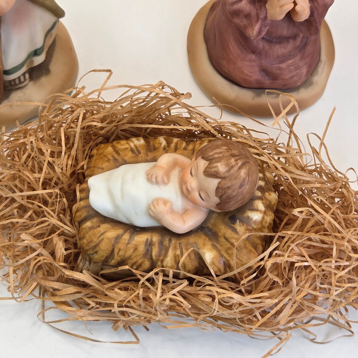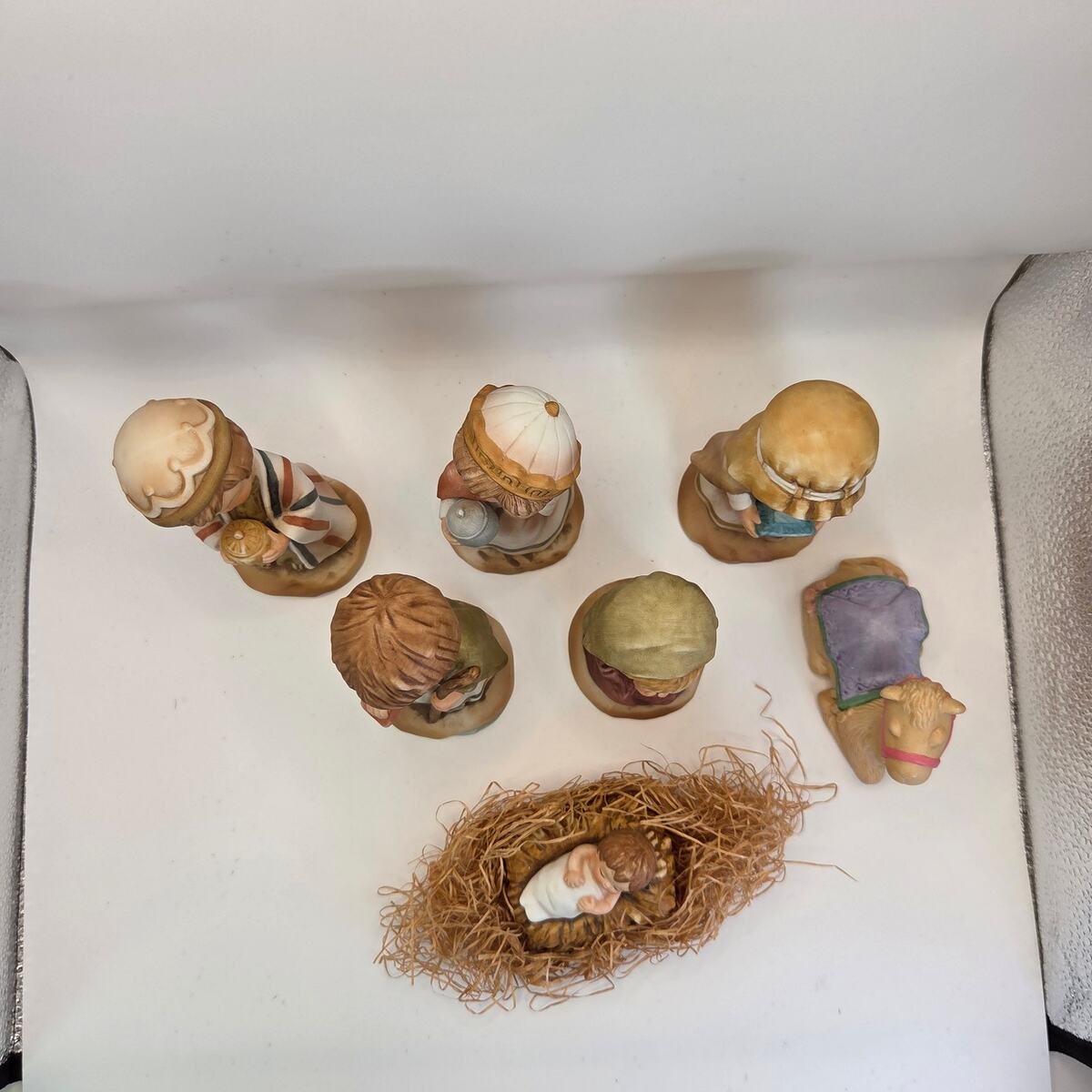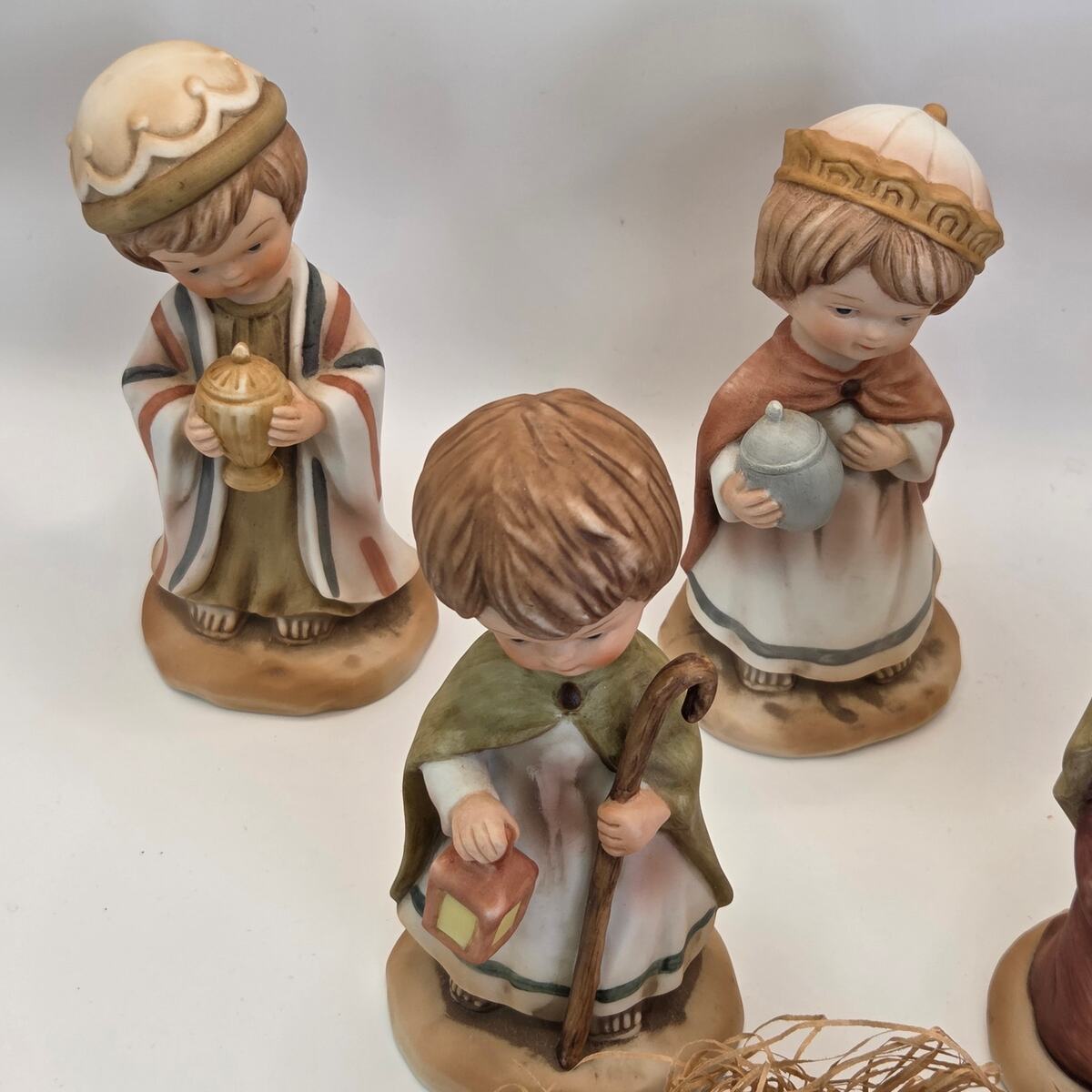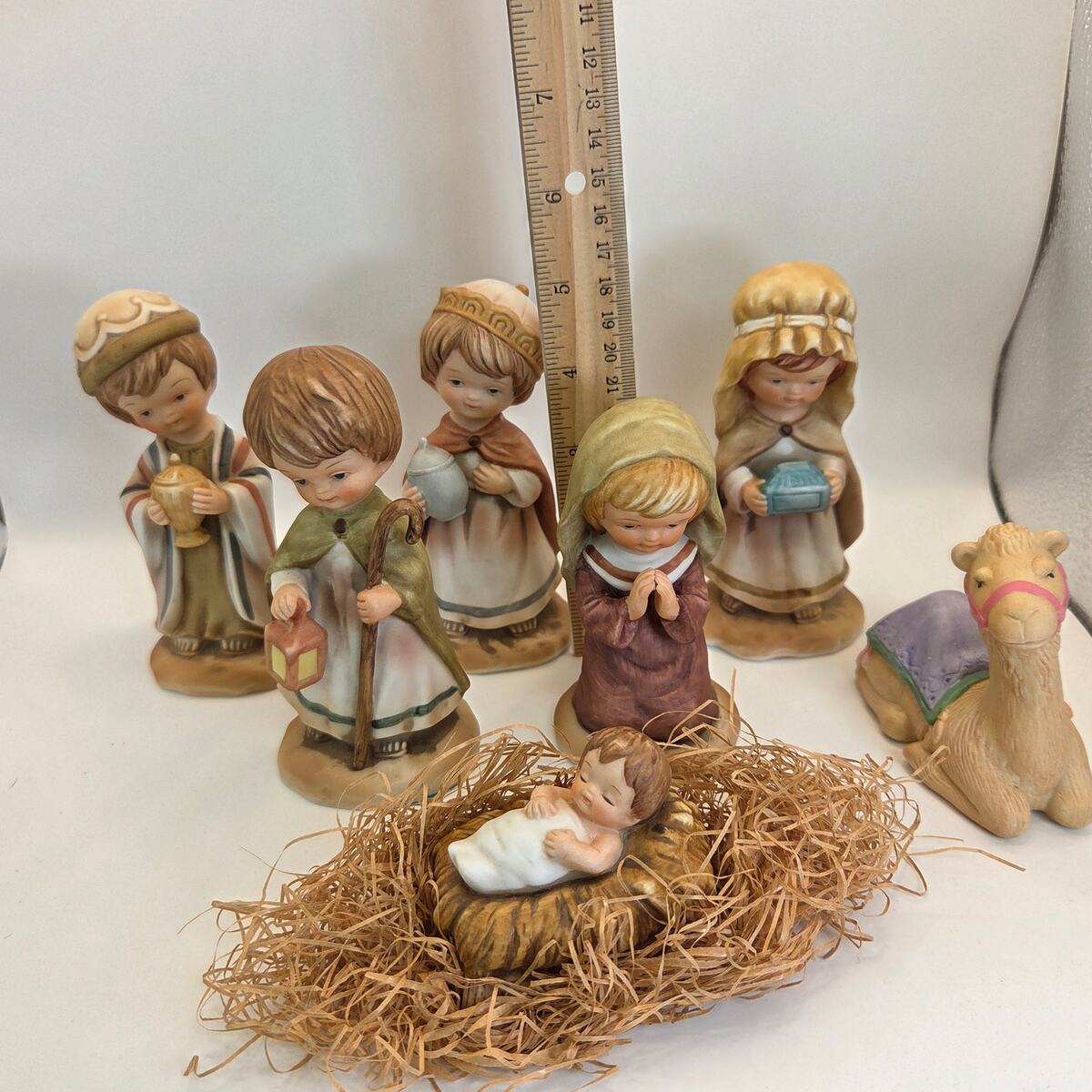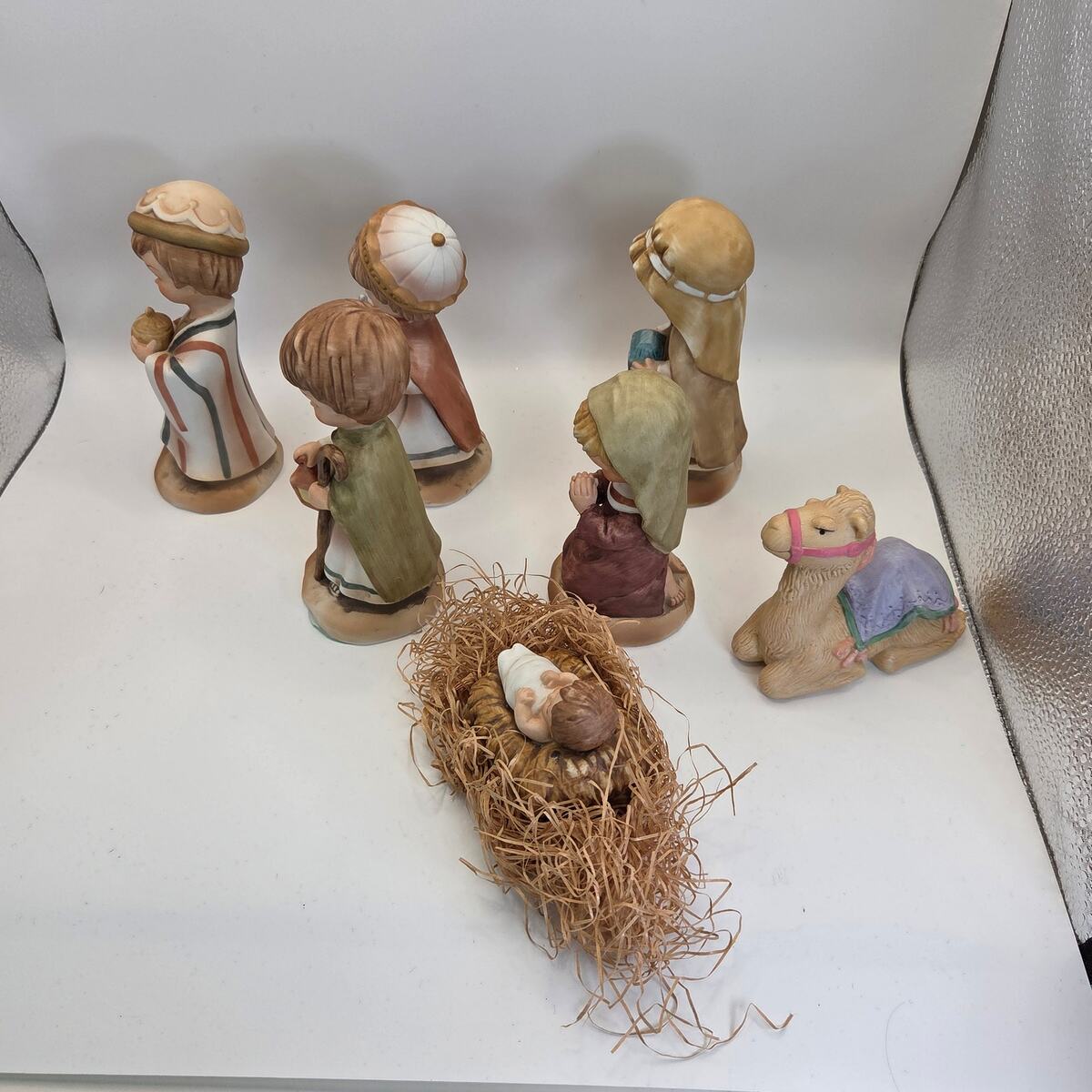 This vintage Nativity set combines six Enesco ?Little Bible Friends? bisque porcelain figures (1980, by Lucas) with one matching Avon porcelain camel (1986). The Enesco set includes Baby Jesus in the manger, Mary, a shepherd, and three Wise Men, all hand-painted in soft pastel tones. The Avon camel is slightly different in style but complements the group well.