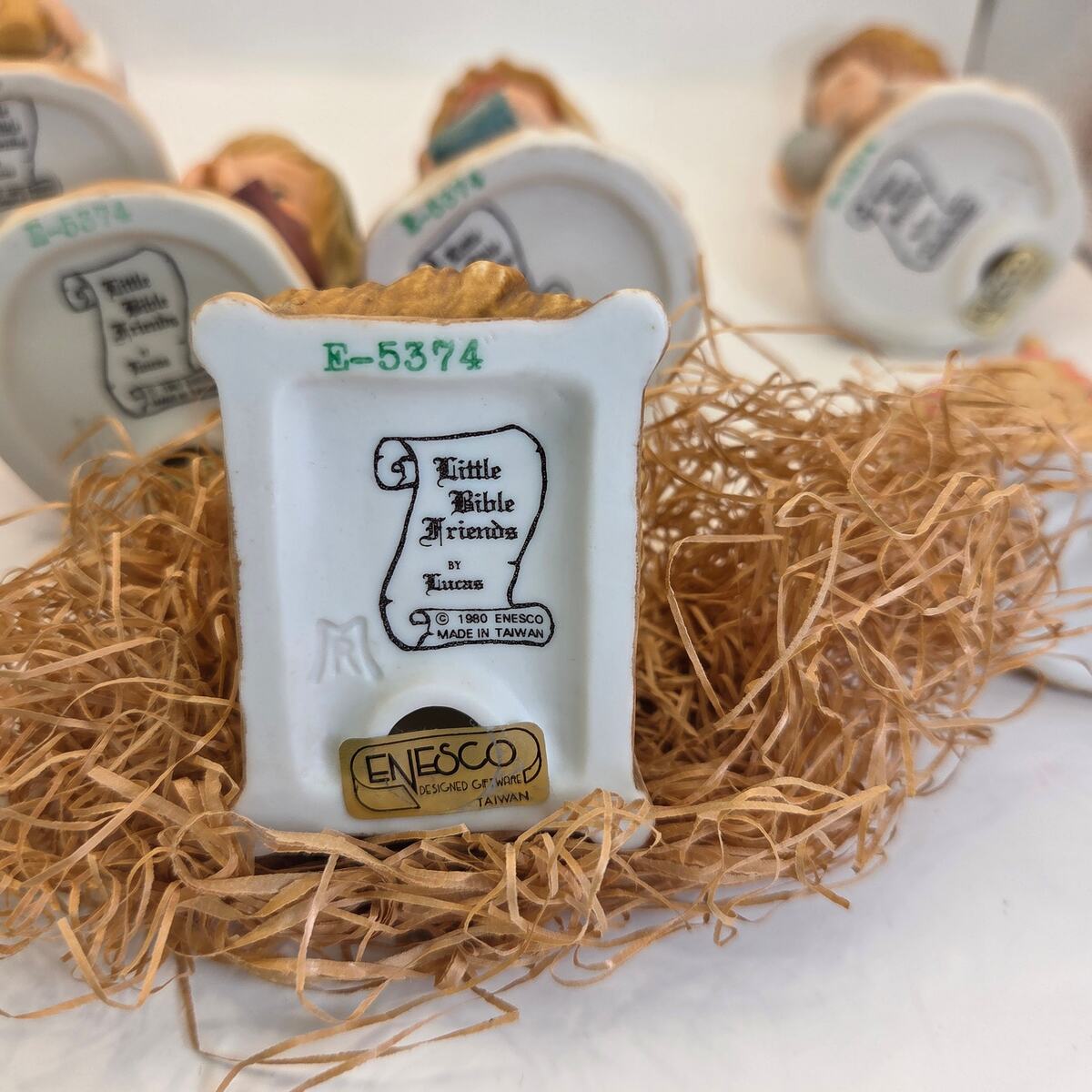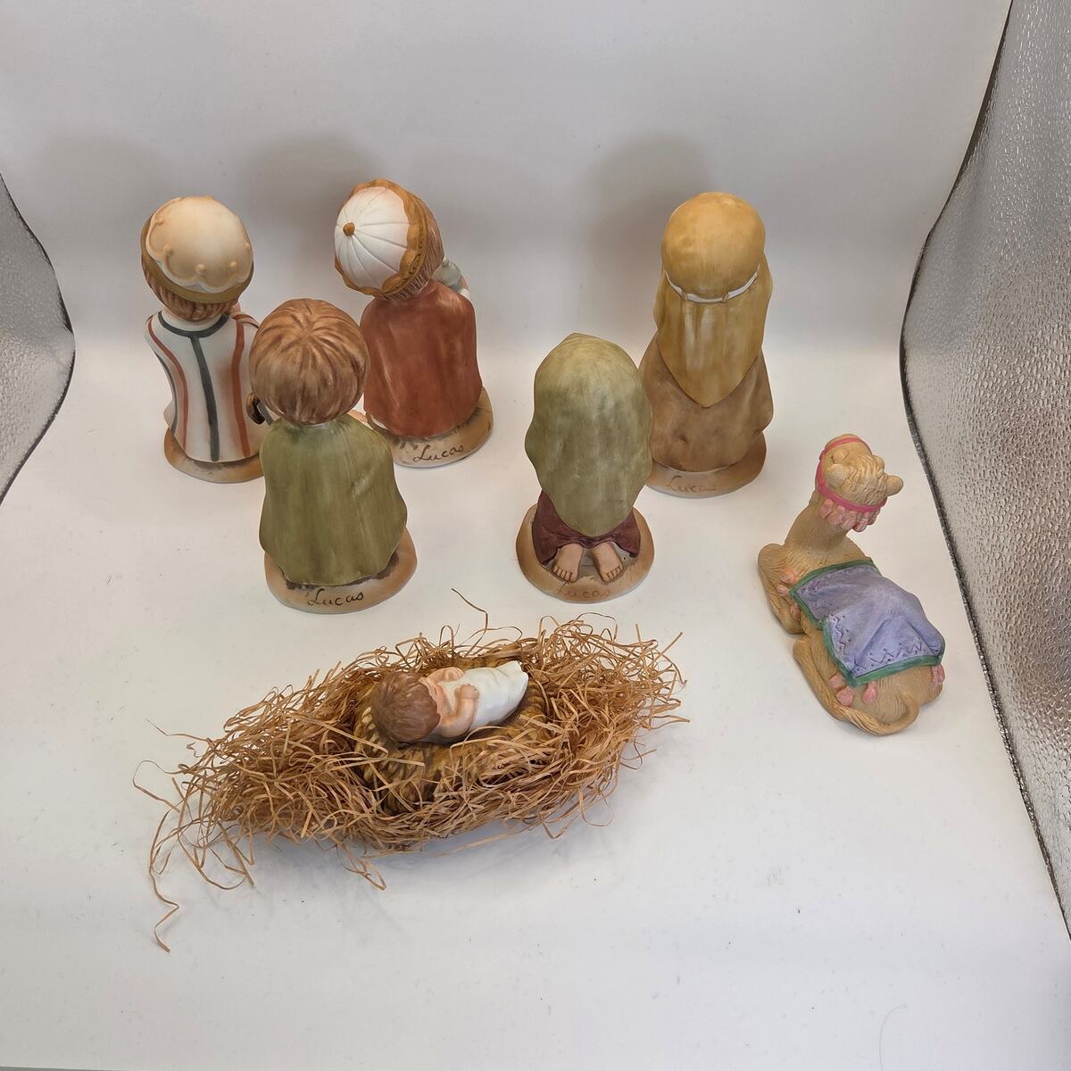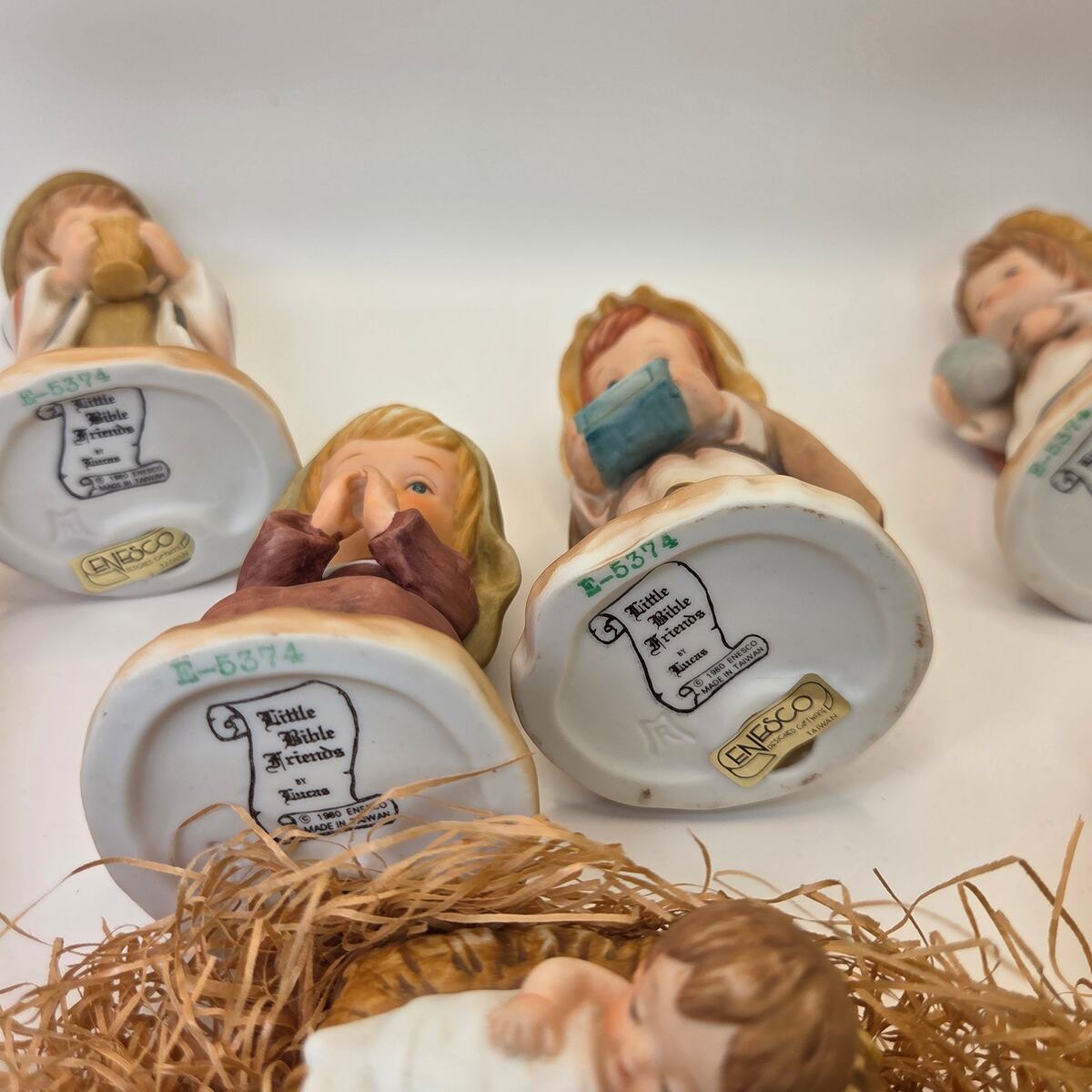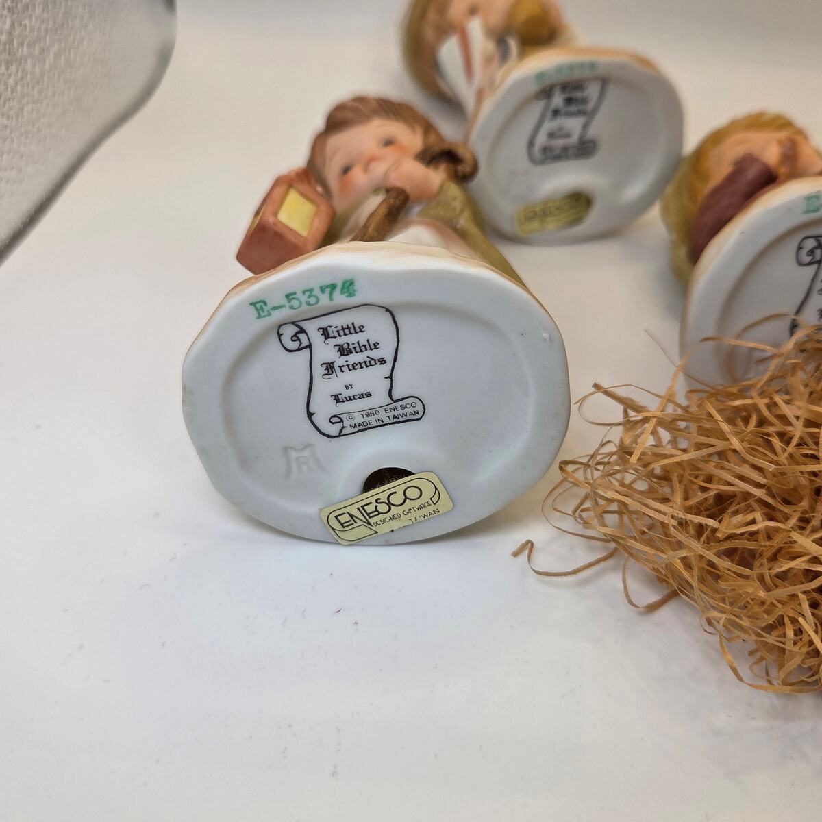 Each figure stands about 4.5?5.5" tall and is marked on the base. The Enesco pieces are stamped Little Bible Friends by Lucas, Enesco 1980, Made in Taiwan. The camel is marked Avon 1986. A wonderful vintage holiday display set and collectible mix for Nativity enthusiasts.