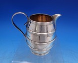 Spectacular English Estate sterling silver syrup pitcher in the form of a barrel with applied handle. This piece was made in London circa 1923 (maker unknown). The pitcher measures 4 1/4" tall and weighs 9.35 troy ounces. It is not monogrammed and is in good vintage condition. Wow!