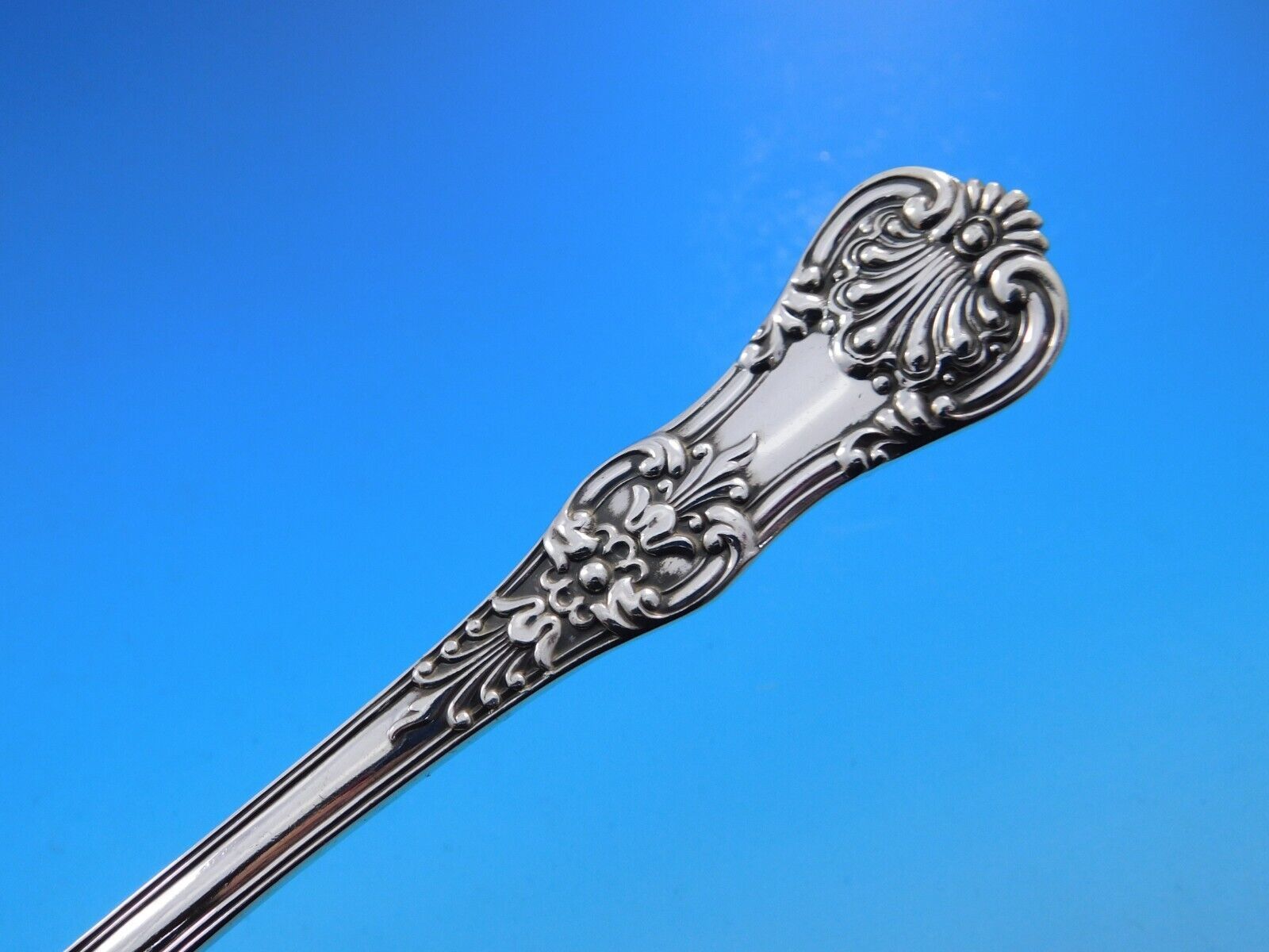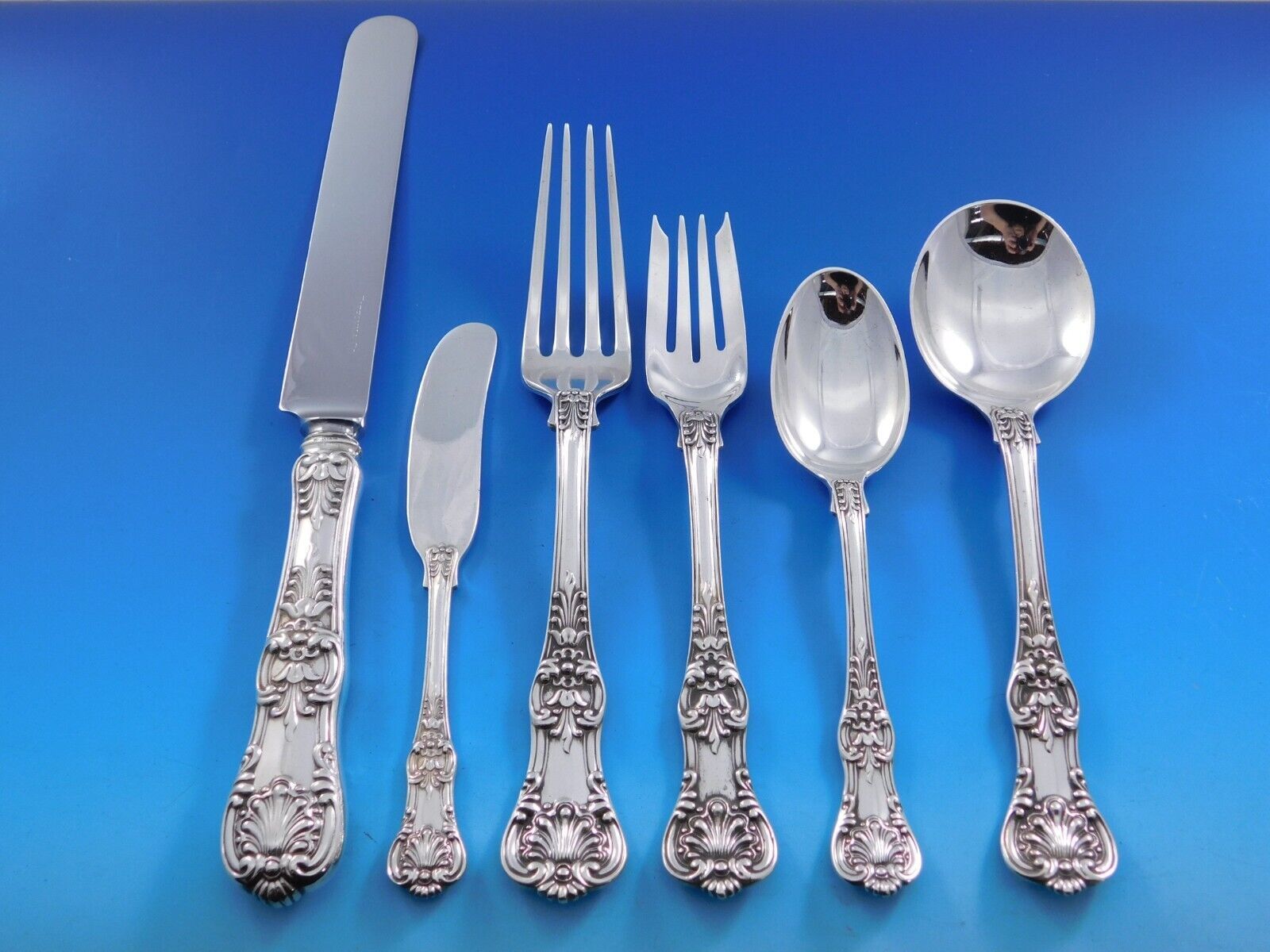 Patterns similar to our English King were first used in France and England late in the eighteenth century and have remained among the most popular styles for flatware today, in both Europe and America. Tiffany Co. first made its own version of English King in 1885. It harmonizes with any eighteenth-century-inspired style neo-Georgian, Colonial, Louis XVI, Sheraton, Chippendale, Adam or Hepplewhite. The rich, intricate decoration of Tiffany's English King pattern reflects the luxurious entertainments given during the latter part of the eighteenth century and will enhance and give a sense of occasion to present-day settings.