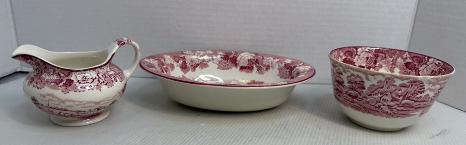 - Enoch Woods Ware English Scenery Bowls & Gravy/ Cream Pink, Red Transferware