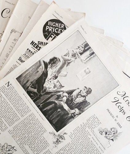 8 issues. Missing front and back covers. Some pages lose. Approx 27-32 pages per magazine... over 200 pages total. Advertisements, illustrations, cartoons, text, Christmas, etc