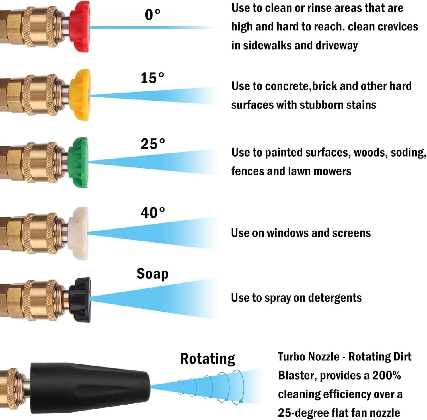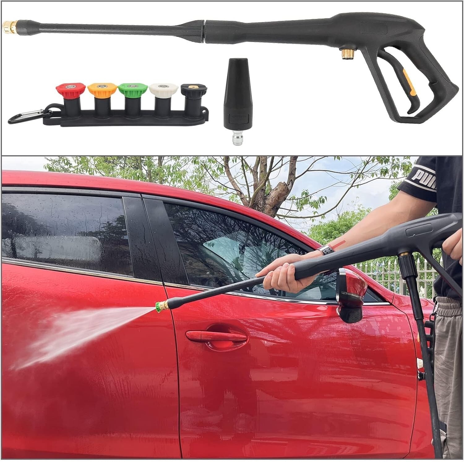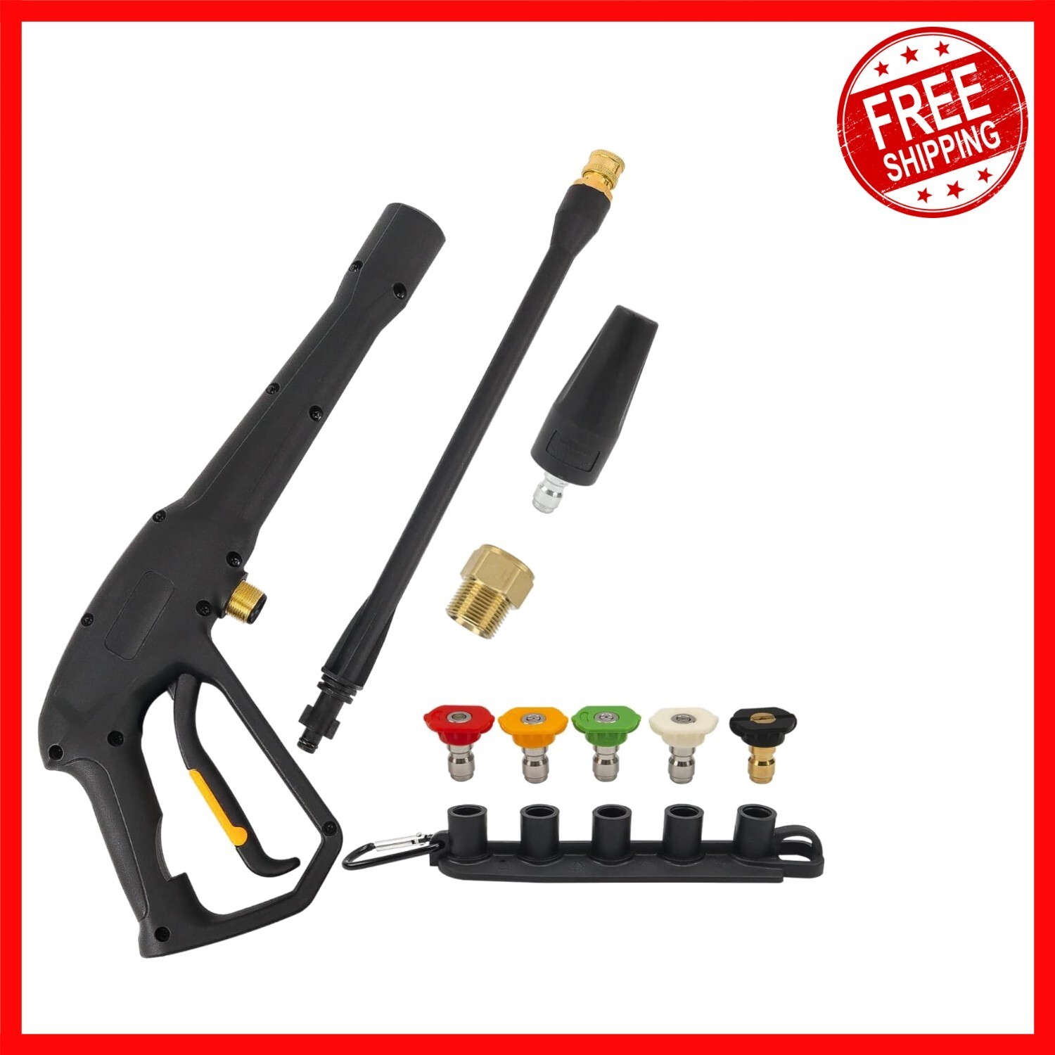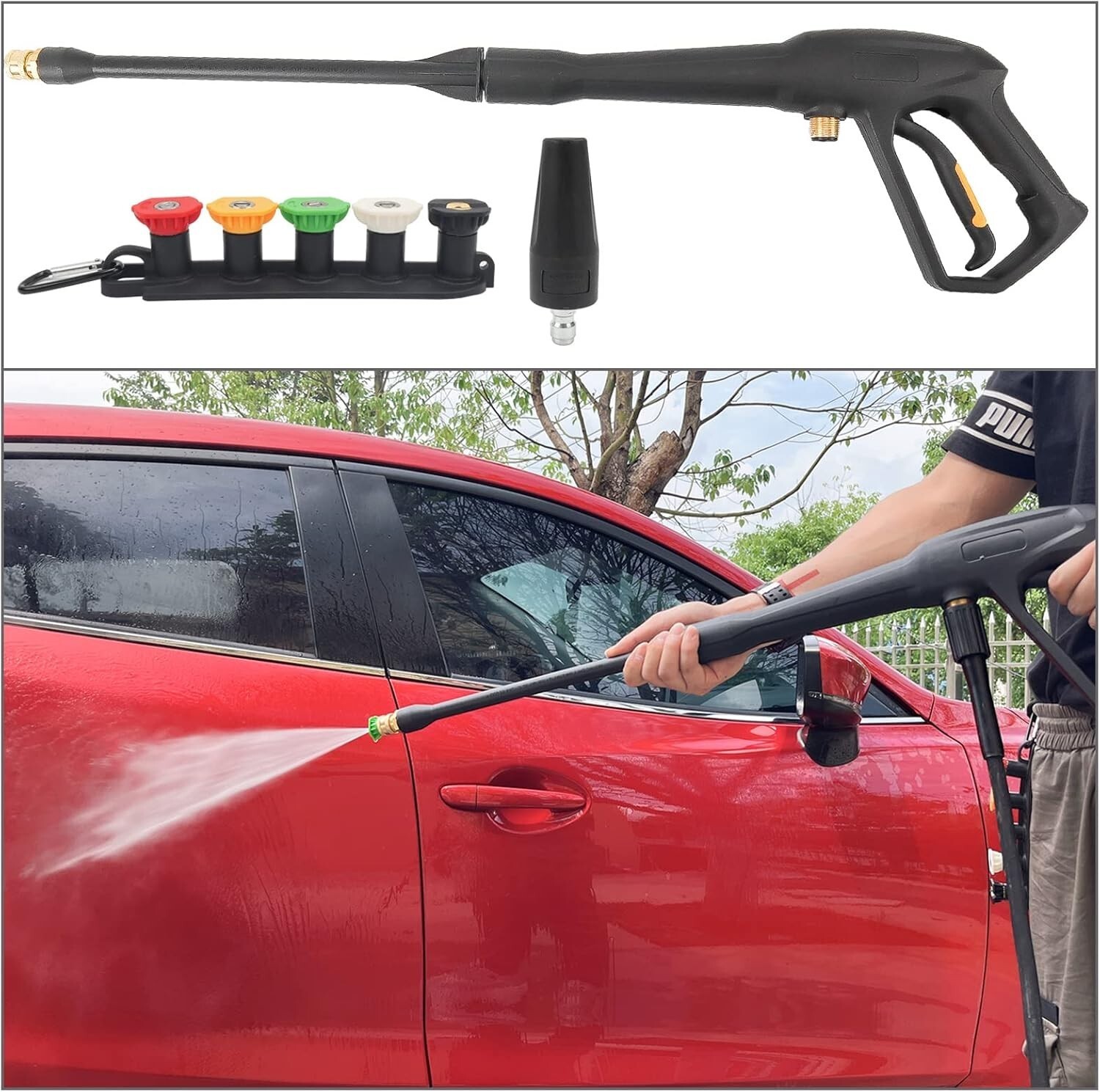 Upgrade your pressure washing setup with our versatile Spray Gun Kit. Includes a high-quality spray gun, spray wand, a selection of five spray tips (0-red, 15-yellow, 25-green, 40-white, 65-black), turbo nozzle, and a convenient nozzle holder belt clip. Designed for compatibility with popular brands such as Greenworks, Ryobi, Karcher, and PowerStroke, ensuring seamless integration with your existing pressure washer.