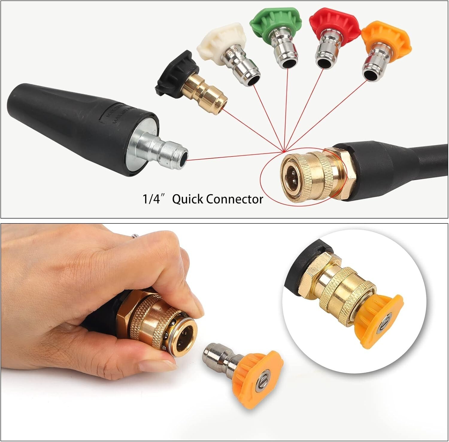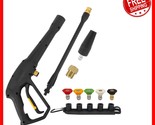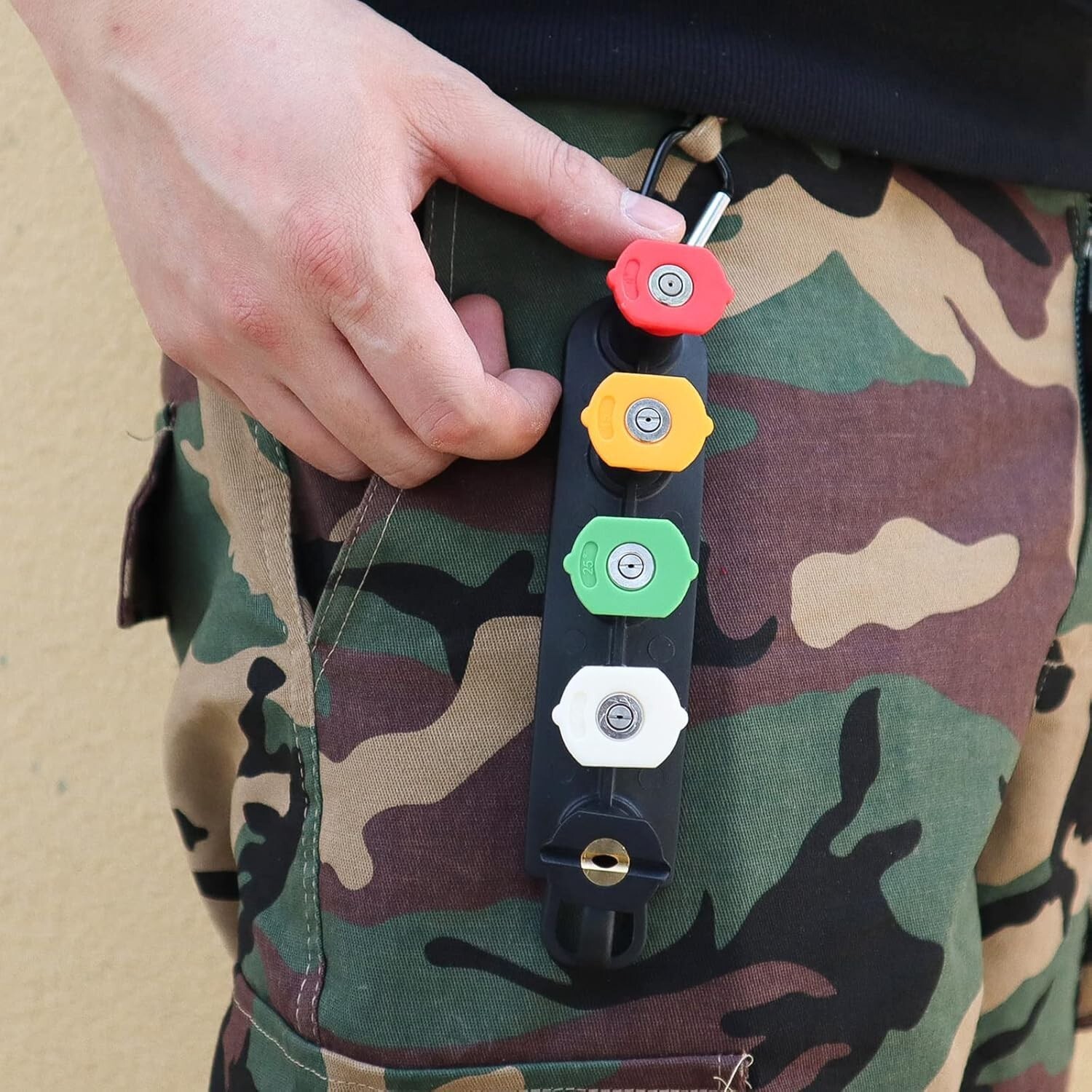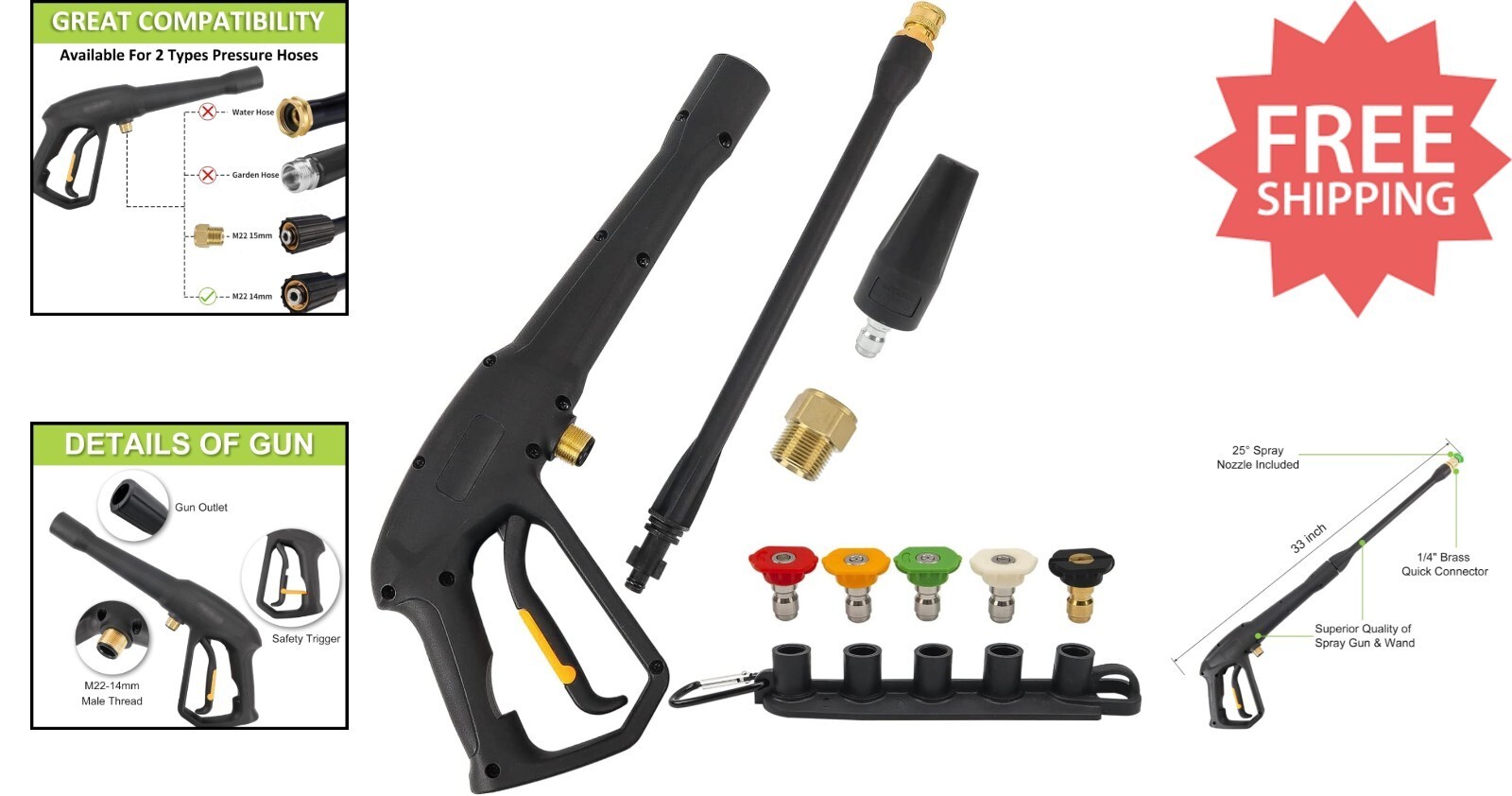 Upgrade your pressure washing setup with our versatile Spray Gun Kit. Includes a high-quality spray gun, spray wand, a selection of five spray tips (0-red, 15-yellow, 25-green, 40-white, 65-black), turbo nozzle, and a convenient nozzle holder belt clip. Designed for compatibility with popular brands such as Greenworks, Ryobi, Karcher, and PowerStroke, ensuring seamless integration with your existing pressure washer.