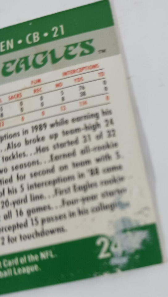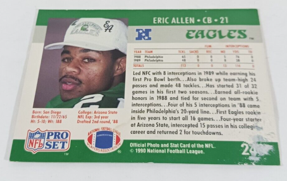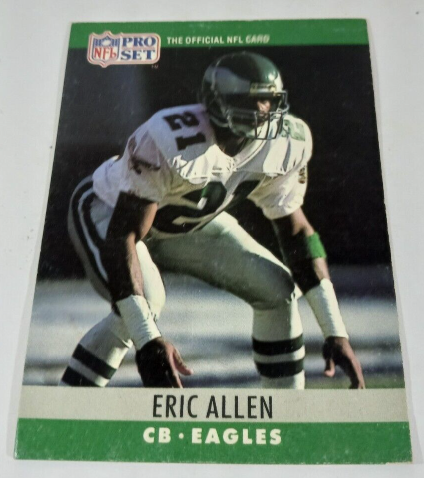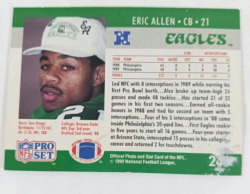 This Eric Allen 1990 Pro Set #243 trading card features the talented Philadelphia Eagles player in action. The card contains his name, team, card number, and year of manufacture as well as the set and type of card. The card is not autographed and is not considered vintage.