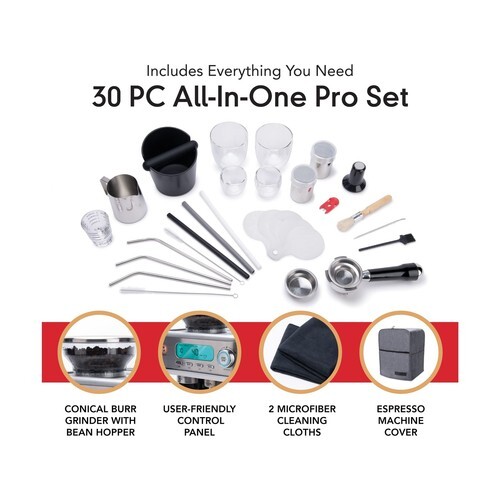 30-Piece Set: Coffee machine with bean grinder comes with 29 other pieces. Includes a detachable water tank with handle and removable lid, stainless steel frothing pitcher, tamper, 4 glasses, 2 shakers, grounds knock box, cleaning tools, and more