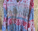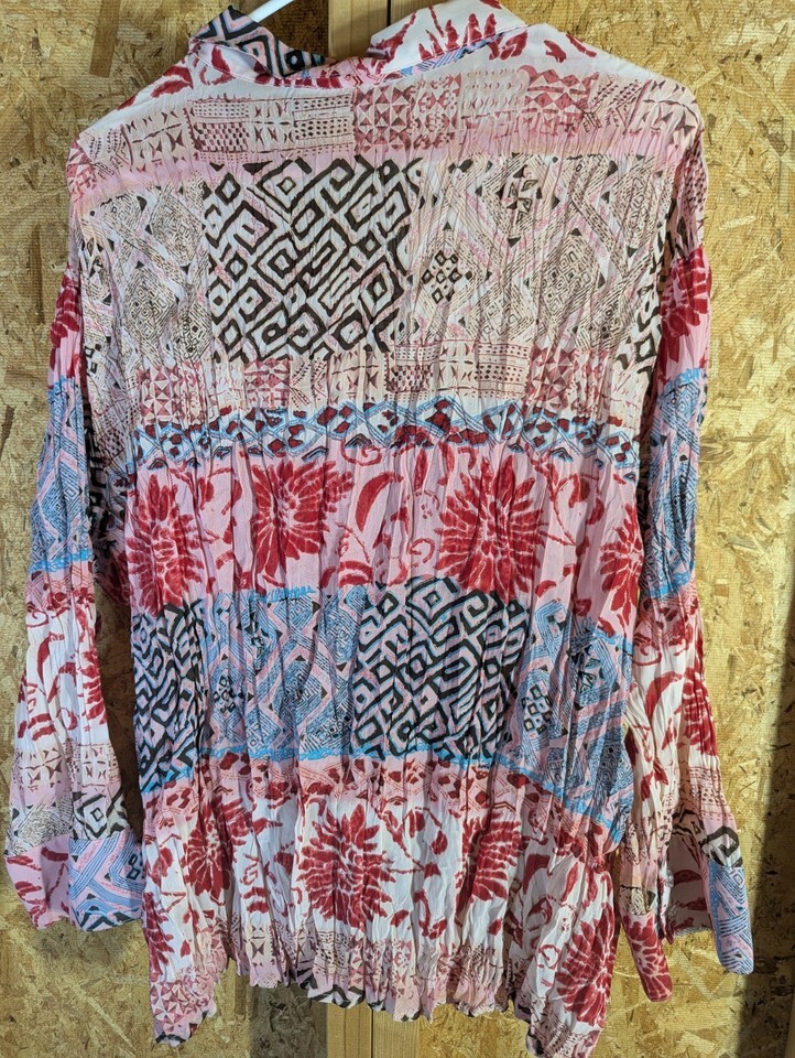 The Essentials by Milano 2X Polyester Floral Button Up Shirt is a stylish and versatile garment suitable for various occasions. Featuring a vibrant floral pattern, long sleeves, and a collared neckline with button closure, this shirt is perfect for travel, parties, casual wear, and even business meetings. Made from lightweight polyester fabric with a touch of glitter accents, this shirt is designed for all seasons and offers a breathable feel. Ideal for women who prefer a plus size fit, this shirt is a must-have addition to any wardrobe for the trendy and fashion-forward individual. 47" chest and 25" length