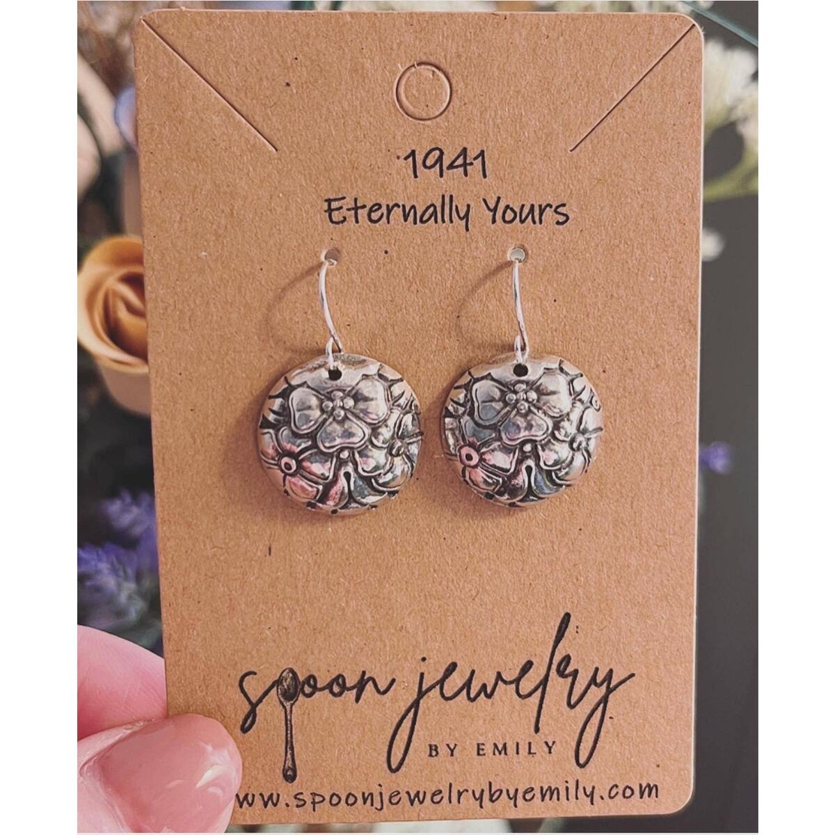 Earrings made from vintage, recycled knife handle! These earrings are in the pattern Eternally Yours And are a BEST SELLER! This pattern is even more beautiful in person.
