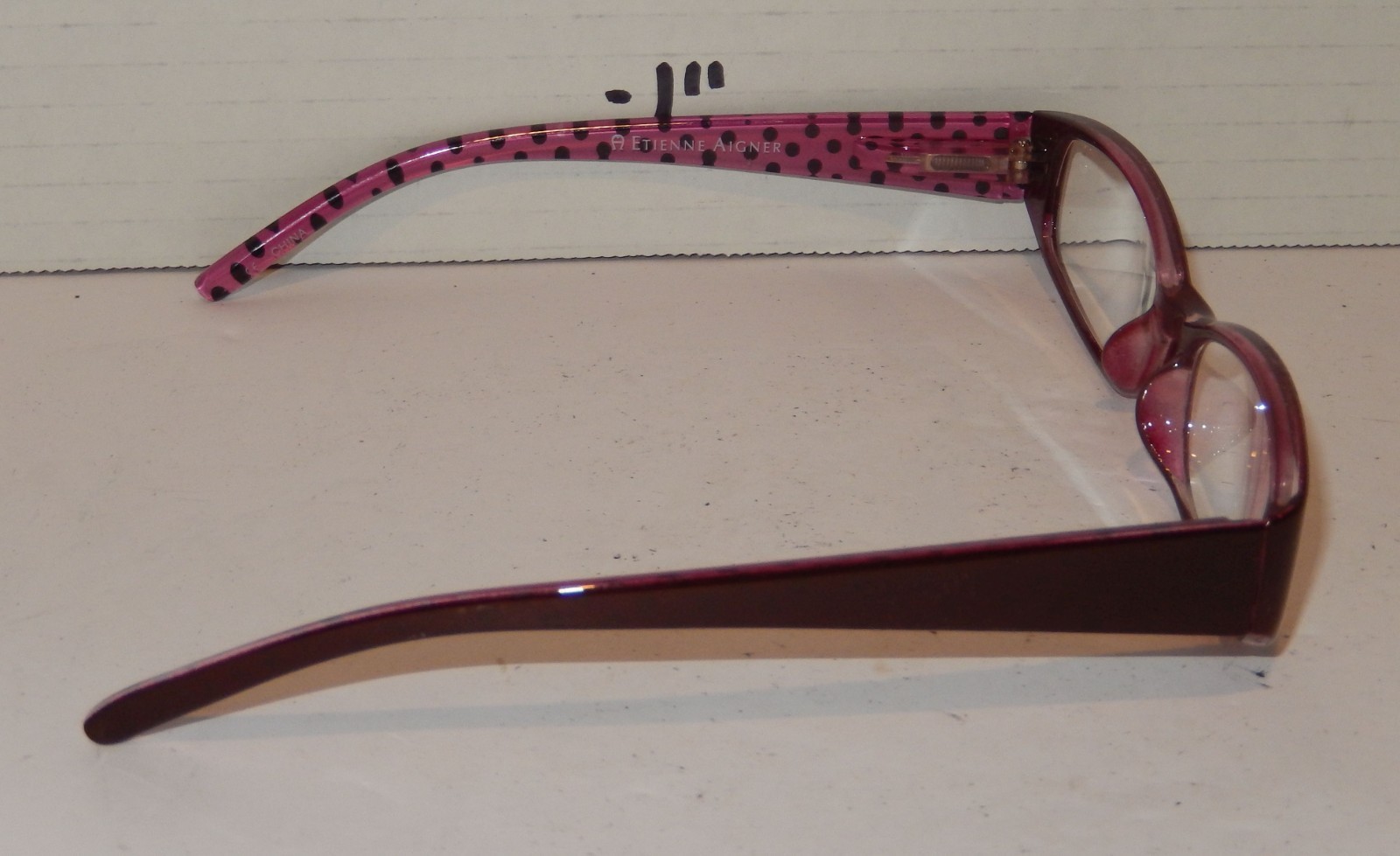 Up for sale is an Etienne Aigner Reading Glasses +2.00 Burgundy Pink Polka Dot Rectangular Frame.